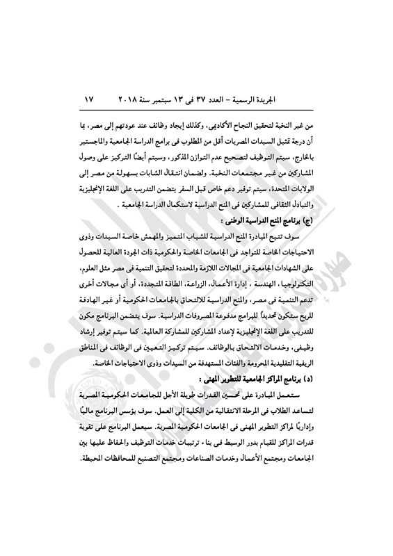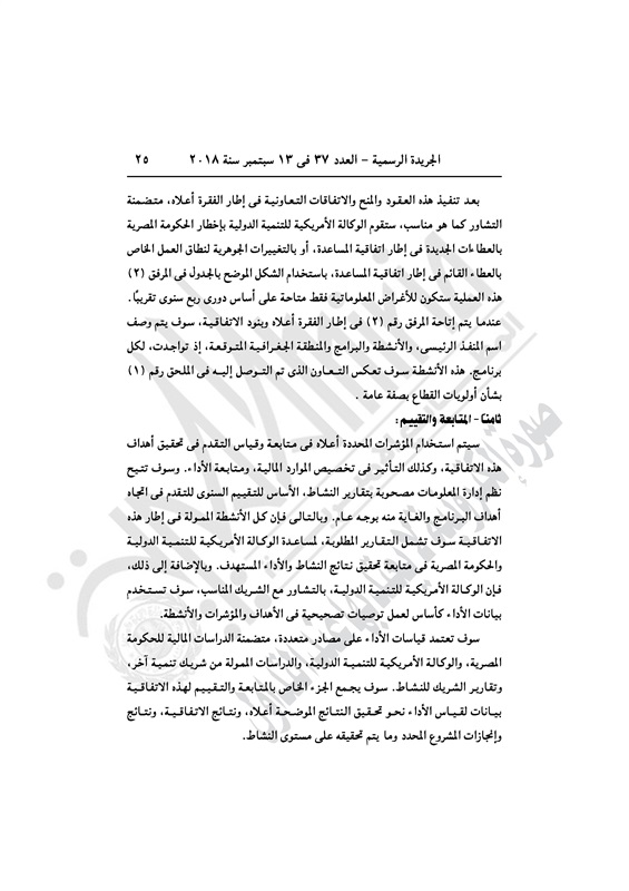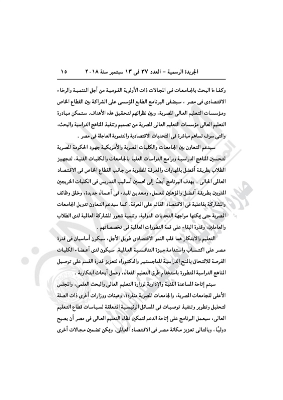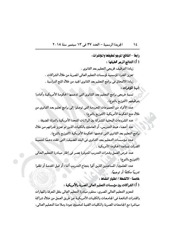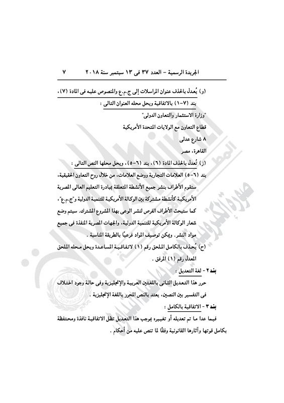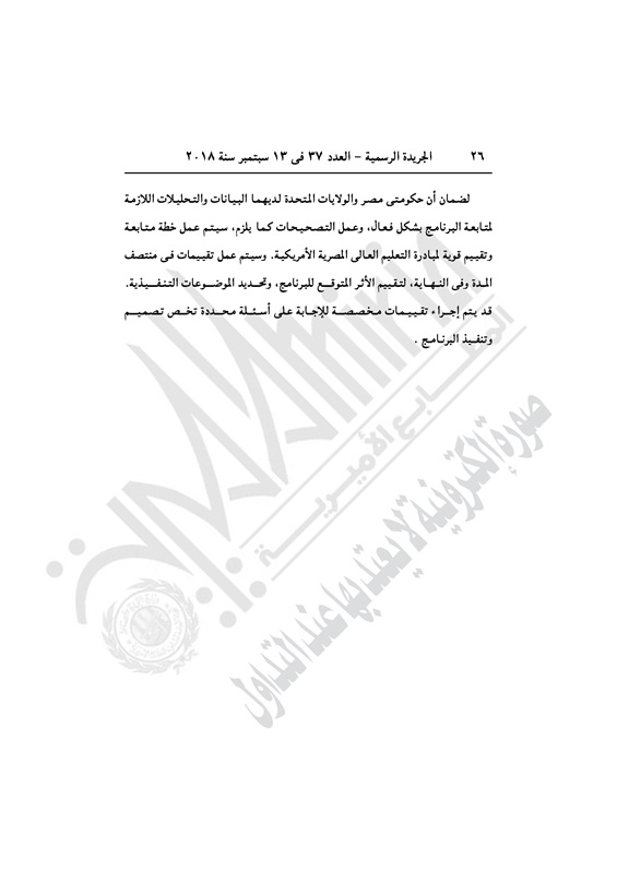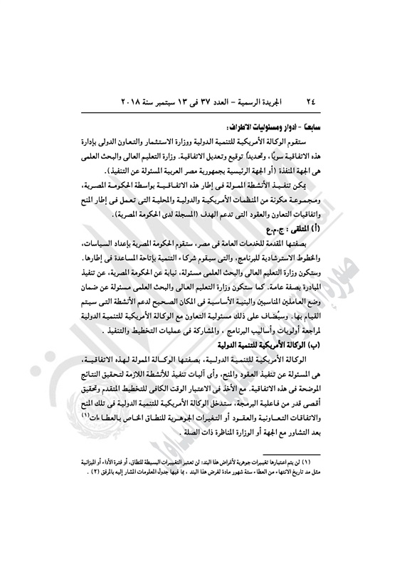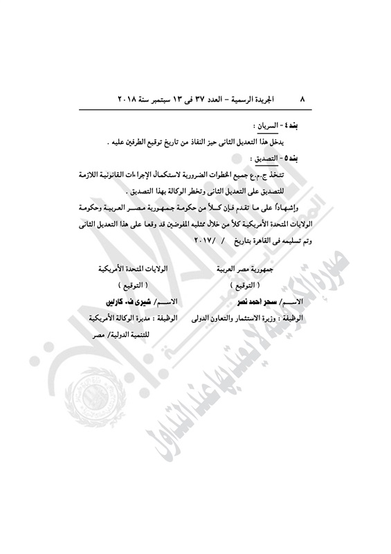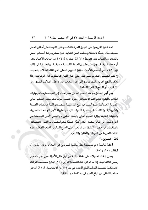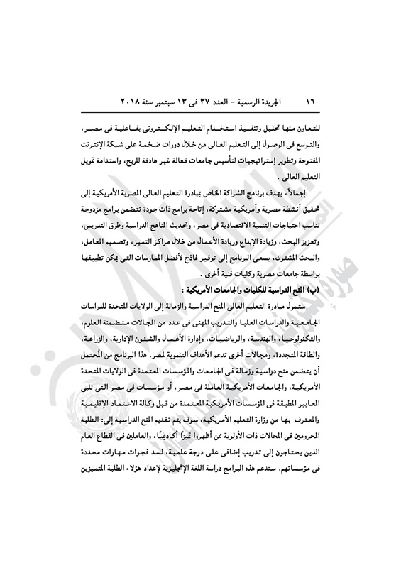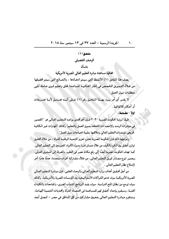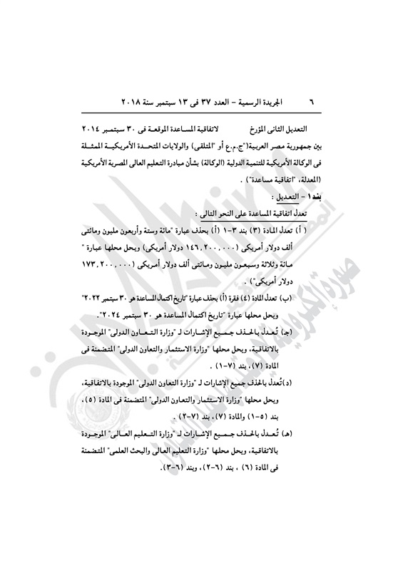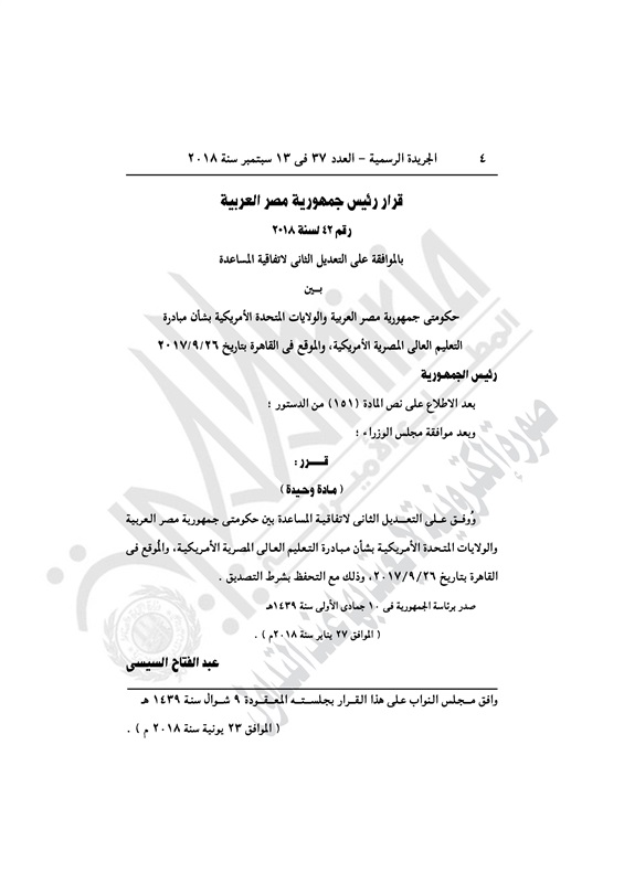 نشرت الجريدة الرسمية في العدد رقم 37 بتاريخ 13 سبتمبر 2018، قرار رئيس الجمهورية رقم 42 لسنة 2018، بالموافقة علي التعديل الثاني لاتفاقية المساعدة بين مصر والولايات المتحدة، بشأن مبادرة التعليم العالي المصرية الأمريكية، والموقع في القاهرة بتاريخ 26 سبتمبر 2017.