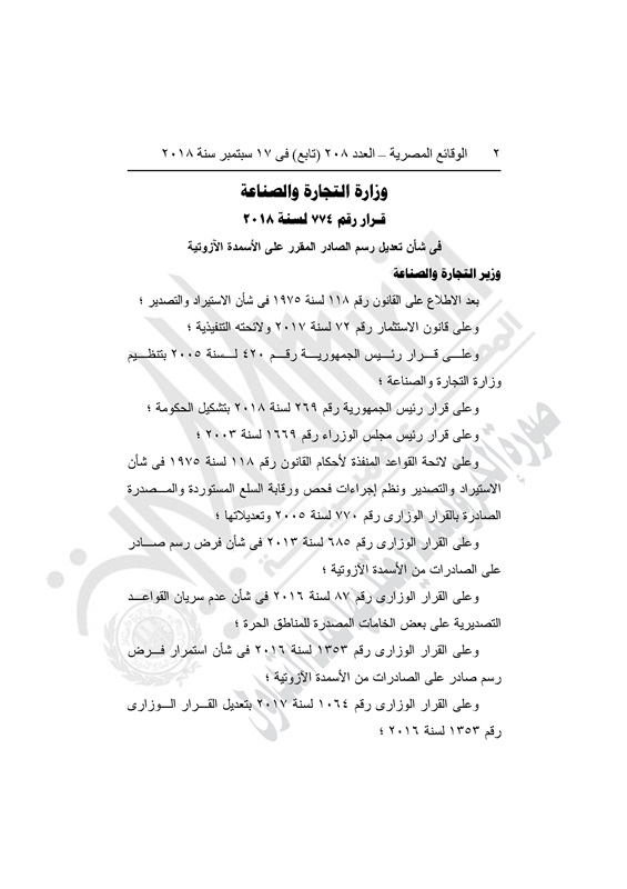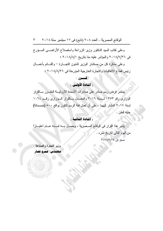 نشرت الوقائع المصرية، فى العدد رقم 208 "تابع" الصادر بتاريخ 17 سبتمبر 2018، قرار وزارة التجارة والصناعة قرار رقم 774 لسنة 2018. بشأن استمرار فرض رسم صادر علي الاسمدة الآزوتية.