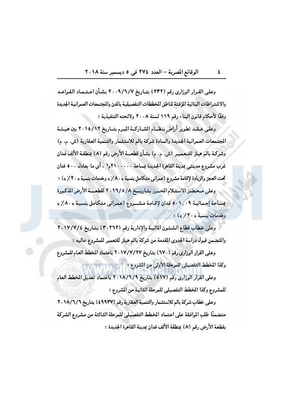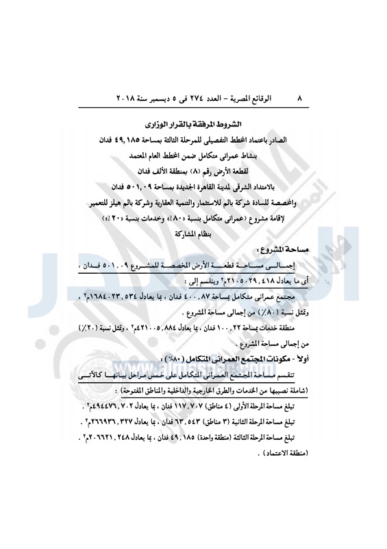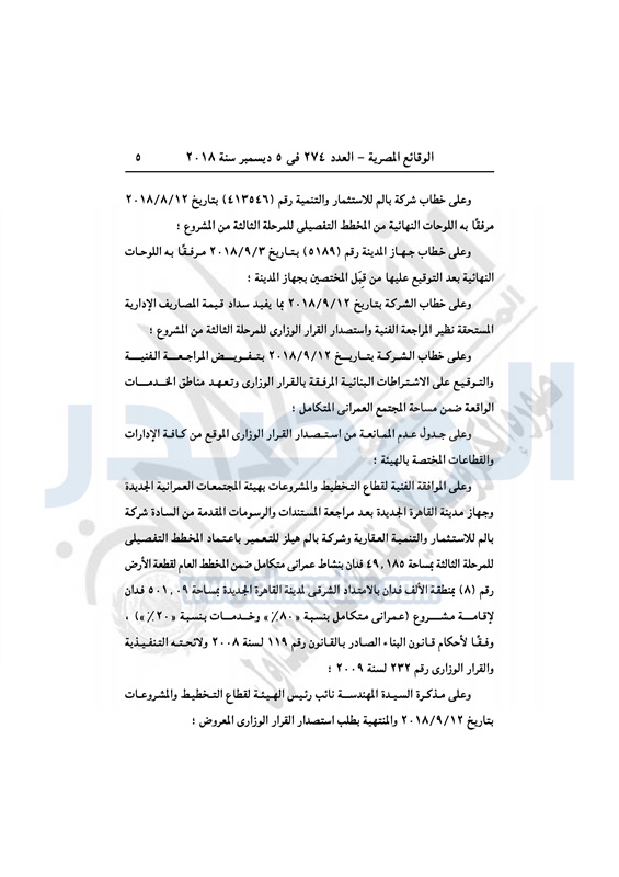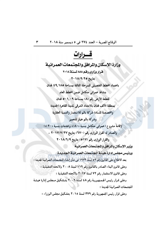 عقارات قرار وزارى باعتماد مخطط المرحلة الثالثة لامتداد القاهرة الجديدة الشرقى الأربعاء 05 ديسمبر 2018 - 10:42 ص 12/5/2018 10:42:48 AM مصطفي مدبولي رئيس مجلس الوزراء - صورة أرشيفية المصدر - خاص طباعة شارك نشرت الوقائع المصرية في العدد رقم 274 تابع الصادر بتاريخ 5 ديسمبر 2018، قرار وزارة الإسكان رقم 888 لسنة 2018. وفيما يلي نص القرار: طباعة شارك وزارة الاسكان قرار تابع المصدر علي جوجل نيوز تطبيق نبض