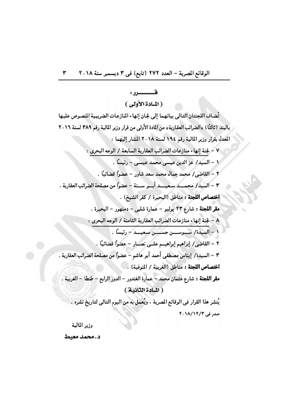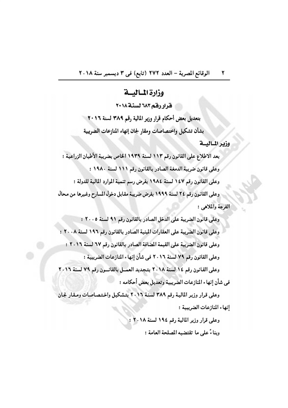 نشرت الوقائع المصرية، فى العدد رقم 272 بتاريخ 3 ديسمبر 2018، قرارًا لوزراة التجارة والصناعة رقم 682 لسنة 2018، بتاريخ 13-9-2018، بشأن تشكيل واختصاصات ومقار لجان وإنهاء المنازعات الضريبية.