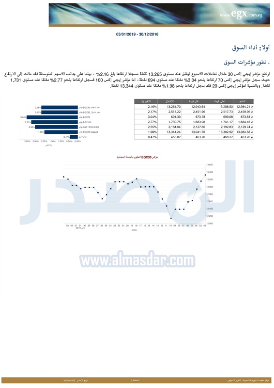 وارتفع مؤشر إيجي إكس 30 خلال جلسات الأسبوع المنتهى اليوم الخميس، بنسبة 2,16%، ليغلق عند مستوى 13,265 نقطة، وصعد مؤشر إيجي إكس 70 بنحو 3,04 %، مغلقا عند مستوى 694 نقطة، كما زاد مؤشر إيجي إكس 100 بنسبة 2,77 % ليغلق عند مستوى 1,731 نقطة، و سجل مؤشر إيجي إكس 20 ارتفاعًا بنحو 1,98 %، مغلقا عند مستوى 13,344 نقطة.