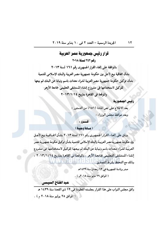 أصدر الرئيس عبد الفتاح السيسي القرار رقم 242 لسنة 2018 بالموافقة على إلغاء القرار الجمهوري رقم 161 لسنة 2013 الخاص باتفاقية بيع لأجل بين الحكومة والبنك الإسلامي للتنمية، بشأن توكيل الأولى لشراء معدات باسم ونيابة عن البنك لاستخدامها في مشروع إنشاء المستشفى التعليمي لجامعة الأزهر والموقعة في القاهرة بتاريخ 14 يناير 2013.