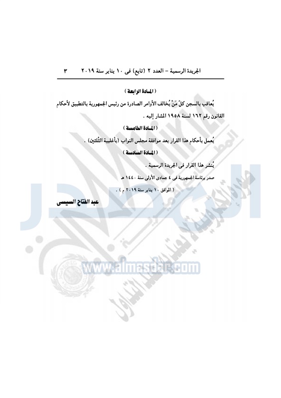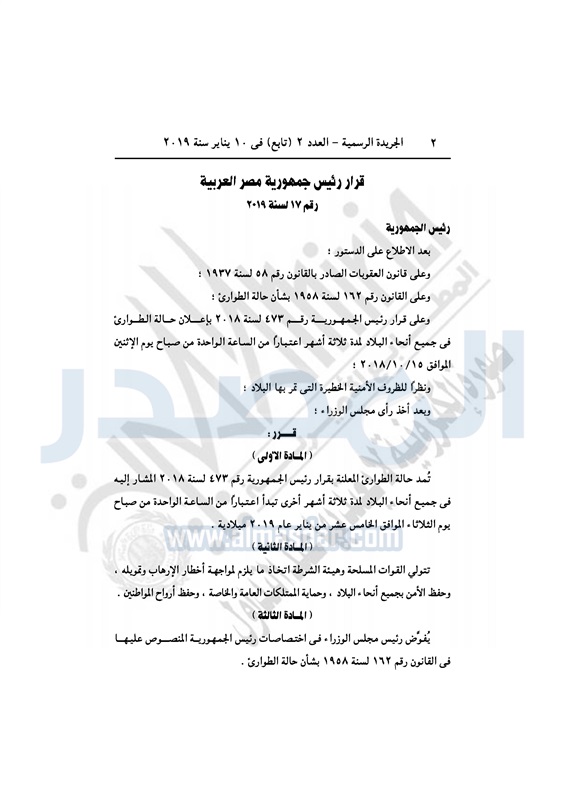 أخبار مصر قرار جمهوري بتمديد حالة الطوارئ 3 أشهر الأحد 13 يناير 2019 - 02:59 م 1/13/2019 2:59:00 PM الرئيس عبد الفتاح السيسى المصدر - خاص طباعة شارك نشرت الجريدة الرسمية في العدد رقم 2 الصدار في 10 يناير 2019، قرار الرئيس عبد الفتاح السيسي رقم 17 لسنة 2019، بشأن تمديد حالة الطوارئ لمدة 3 أشهر.وفيما يلي نص القرار: طباعة شارك قرار حالة الطوارئ الرئيس عبد الفتاح السيسي الرئيس الجريدة الرسمية تابع المصدر علي جوجل نيوز تطبيق نبض