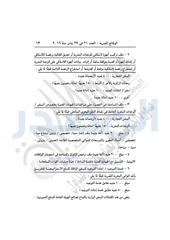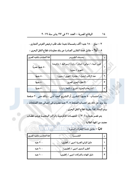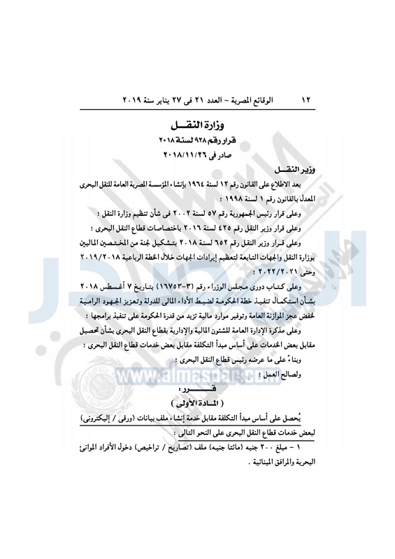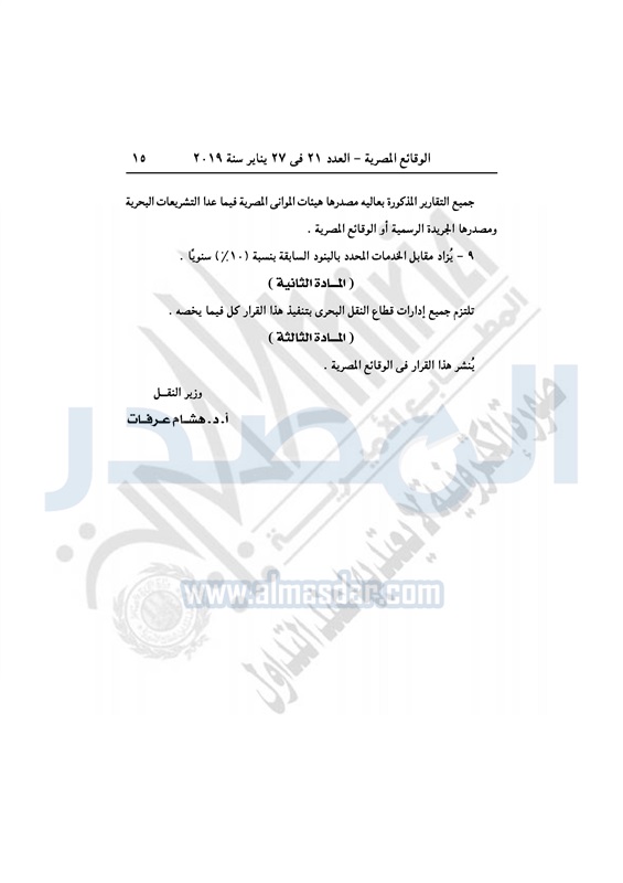 أخبار مصر قرار وزاري بزيادة رسوم وتراخيص النقل البحري الأحد 27 يناير 2019 - 10:12 ص 1/27/2019 10:12:00 AM هشام عرفات وزير النقل المصدر - خاص طباعة شارك نشرت الوقائع المصرية، في العدد رقم 21 بتاريخ 27 يناير 2019، قرار وزارة النقل رقم 928 لسنة 2018 صادر في 26-11-2018. ونص القرار: طباعة شارك وزارة النقل قرار الوقائع المصرية تابع المصدر علي جوجل نيوز تطبيق نبض