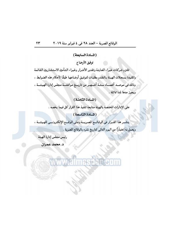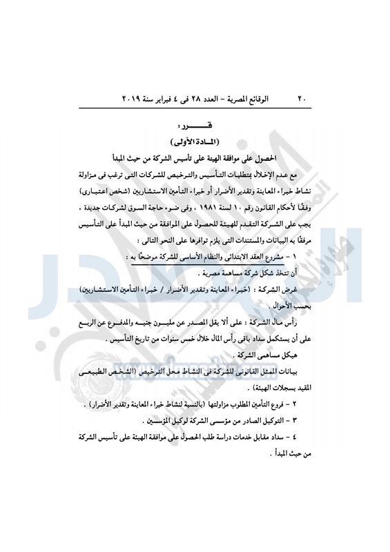 نشرت الوقائع المصرية، في العدد رقم 28 بتاريخ 4 فبراير 2019، قرار الهيئة العامة للرقابة المالية، رقم 193 لسنة 2018، بتاريخ 31 ديسمبر 2018، بشأن شروط وقواعد وإجراءات الترخيص والقيد لمزاولة النشاط لشركات خبراء المعاينة وتقدير الأضرار وخبراء التأمين الاستشاريين «شخص اعتباري».