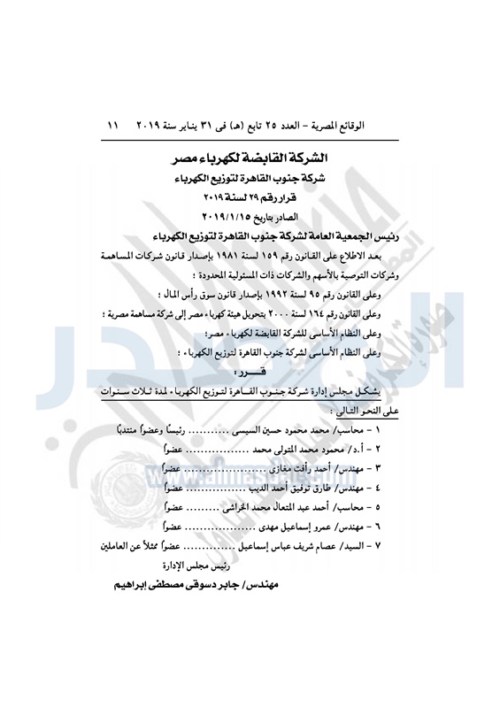 نشرت الوقائع المصرية، في العدد رقم 25 تابع «هـ» بتاريخ 31 يناير 2019، قرار وزارة الكهرباء والطاقة المتجددة، رقم 11 لسنة 2019، بتاريخ 15-1-2019، بشأن تشكيل مجلس إدارة الشركة القابضة لكهرباء مصر لمدة 3 سنوات.