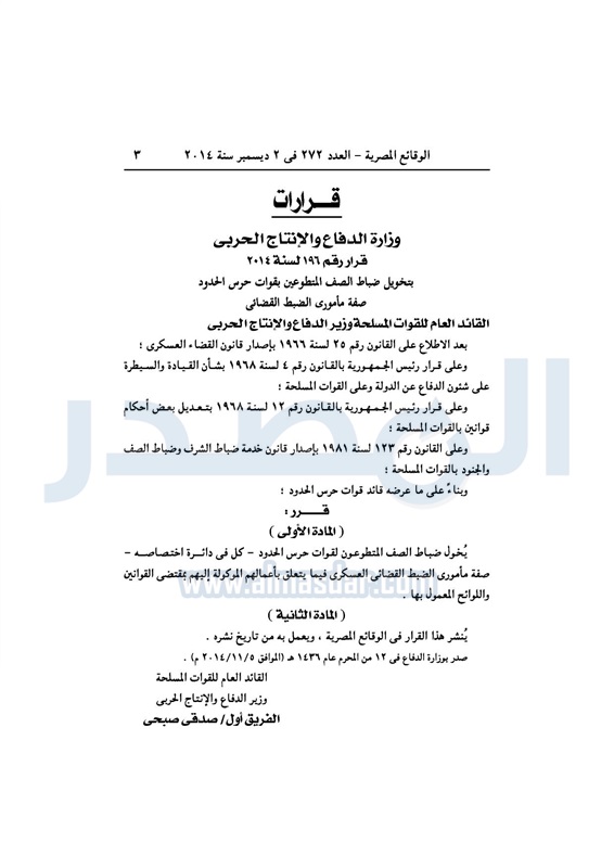 أخبار مصر قرار بمنح الضبطية القضائية العسكرية لضباط الصف المتطوعون بحرس الحدود الثلاثاء 02 ديسمبر 2014 - 02:29 م 12/2/2014 2:29:47 PM وزير الدفاع والانتاج الحربى الفريق صدقى صبحى المصدر - خاص طباعة شارك طباعة شارك تابع المصدر علي جوجل نيوز تطبيق نبض