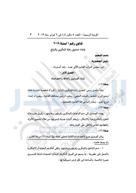 ريادة أعمال قرار جمهورى بإنشاء صندوق رعاية المبتكرين والنوابغ الخميس 07 فبراير 2019 - 04:51 م 2/7/2019 4:51:00 PM المصدر - خاص طباعة شارك نشرت الجريدة الرسمية العدد 5 مكرر «د» فى فبراير 2019، قرار رئيس الجمهورية، قانون رقم 1 لسنة 2019 بشأن إنشاء صندوق رعاية المبتكرين والنوابغ.وفيما يلى نص القرار: طباعة شارك قرار قانون رئيس الجمهورية الجريدة الرسمية تابع المصدر علي جوجل نيوز تطبيق نبض