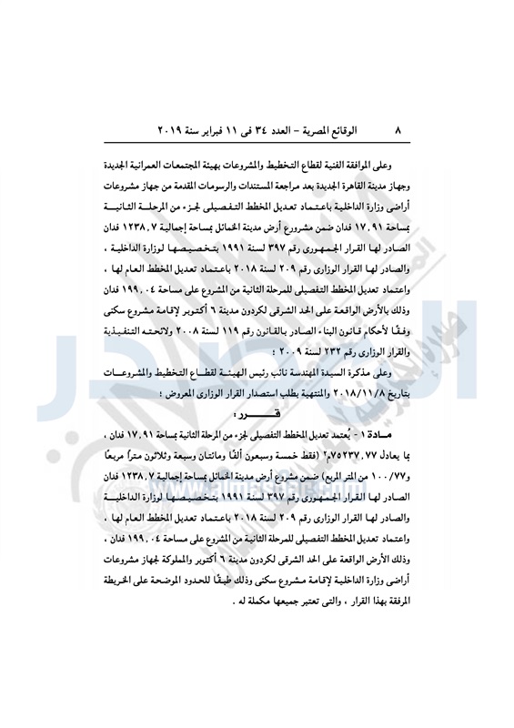 نشرت الوقائع المصرية، في العدد رقم 34 بتاريخ 11 فبراير 2019، قرار وزارة الإسكان والمرافق والمجتمعات العمرانية، رقم 1041 لسنة 2018، بتاريخ 15 نوفمبر 2018، بشأن اعتماد تعديل المخطط التفصيلي لجزء بالمرحلة الثانية بمساحة 17,91 فدان، ضمن مشروع أرض مدينة الخمائل بمساحة إجمالية 1238,7 فدان، الواقعة أمام نادي الخمائل على الحد الشرقي لكردون مدينة 6 أكتوبر والمملوكة لجهاز مشروعات أراضي وزارة الداخلية، لإقامة مشروع سكني، والصادر لها القرار الجمهوري رقم 397 لسنة 1911.