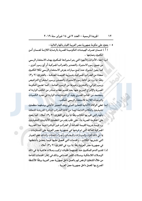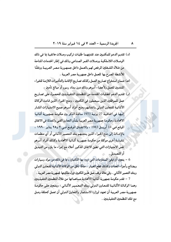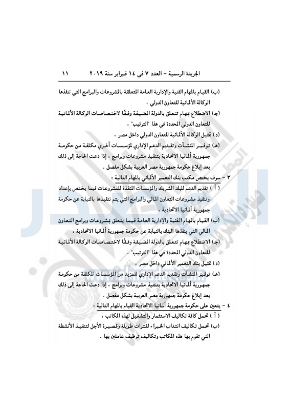 نشرت الجريدة الرسمية في العدد 7 بتاريخ 14 فبراير 2019، قرار رئيس الجمهورية رقم 486 لسنة 2018 بالموافقة على الخطابات المتبادلة بين حكومتي مصر وألمانيا بشأن إنشاء مكتب محلي واحد للوكالة الألمانية للتعاون الدولي «GIZ» ومكتب واحد محلي لبنك التعمير الألماني «KFW» في القاهرة، والموقعة في القاهرة بتاريخ 7 يونيو 2018.