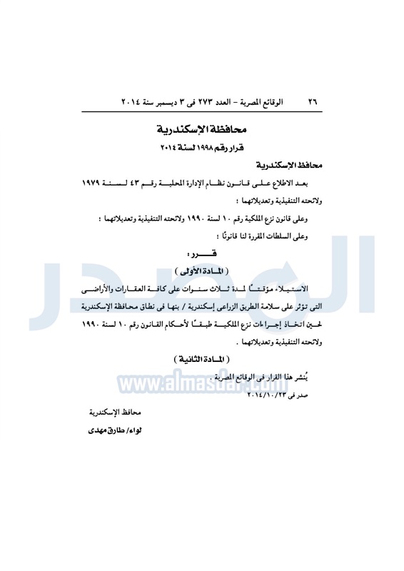 أخبار مصر قرار "محافظ الاسكندرية" بالاستيلاء المؤقت على العقارات التى تؤثر على الطريق الزراعى الأربعاء 03 ديسمبر 2014 - 11:20 ص 12/3/2014 11:20:00 AM محافظ الاسكندرية لواء طارق مهدى المصدر - خاص طباعة شارك طباعة شارك تابع المصدر علي جوجل نيوز تطبيق نبض