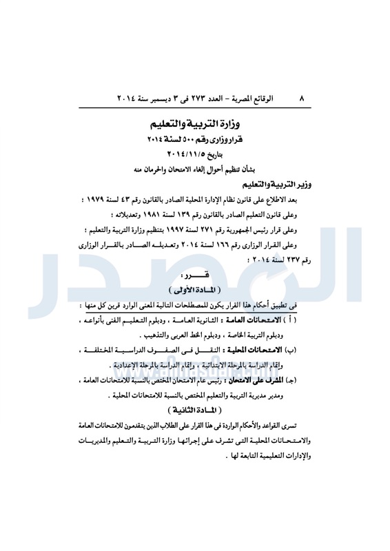 أخبار مصر قرار "وزير التربية والتعليم" بحالات الغاء الامتحان للطالب فى مراحل التعليم المختلفة الأربعاء 03 ديسمبر 2014 - 11:36 ص 12/3/2014 11:36:00 AM وزير التربية والتعليم محمود ابو النصر المصدر - خاص طباعة شارك طباعة شارك تابع المصدر علي جوجل نيوز تطبيق نبض