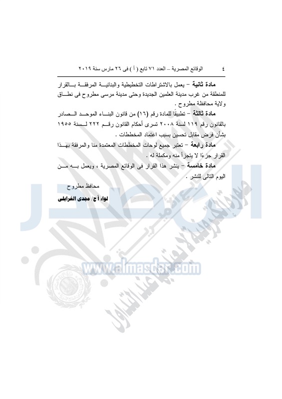 نشرت الوقائع المصرية في العدد 71 تابع «أ» بتاريخ 26 مارس 2019، الإدارة العامة للتخطيط العمرانى الشروط المرفقة بقرار محافظ مطروح رقم 102 لسنة 2019، بشأن اعتماد المخططات التوجيهية والمخططات الهيكلية للساحل الشمالى الغربى للمنطقة الواقعة من حدود غرب مدينة العلمين الجديدة حتى مدينة مرسى مطروح .
