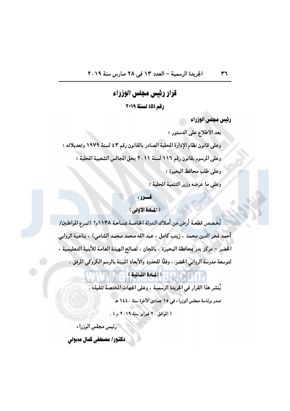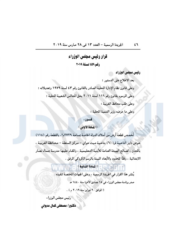 نشرت الجريدة الرسمية في العدد 13 الصادر اليوم الخميس 28 مارس 2019، قرارات رئيس مجلس الوزراء أرقام 448، 449، 450،451، 452، 453، 454، 455، 456، 457، 458، 459، 460، 461، 462، 463، 464، بشأن تخصيص عدة قطع أراض لإقامة مشروعات خدمية بالمحافظات.