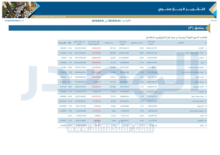 كشف التقرير ربع السنوي للبورصة المصرية، عن الفترة من 1 يناير إلى 31 مارس 2019، ارتفاع مؤشر «إيجي إكس 30» بنحو 13,06% عند 14,737,88 نقطة.