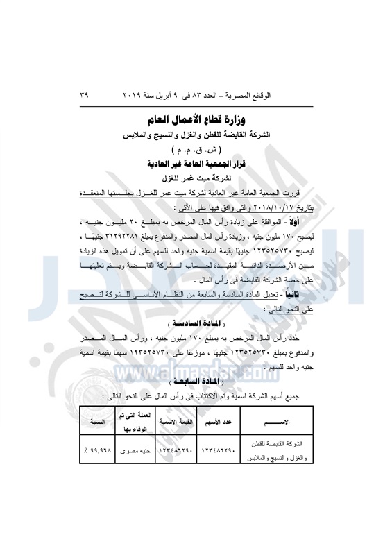 نشرت الوقائع المصرية في العدد 83 بتاريخ 9 أبريل 2019، قرار وزارة قطاع الأعمال العام بالموافقة على زيادة رأس المال المرخص به للشركة القابضة للقطن والغزل والنسيج والملابس، بمبلغ 20 مليون جنيه ليصبح 170 مليون جنيه ، وزيادة رأس المال المصدر والمدفوع بمبلغ 31292281 جنيهًا ليصبح 123525730 جنيهًا بقيمة أسمية جنيهًا واحدًا للسهم.