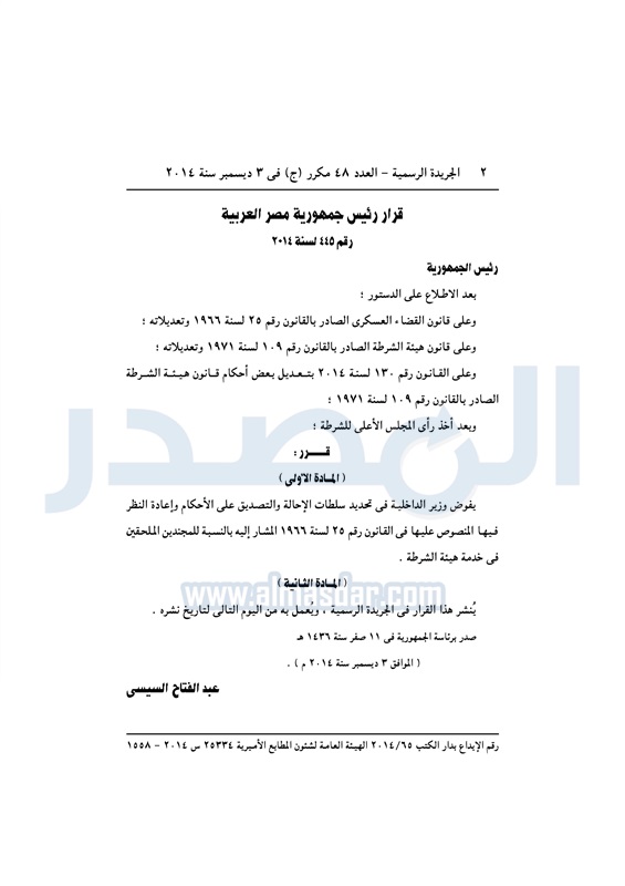 أخبار مصر قرار جمهورى بتفويض وزير "الداخلية" فى التصديق على احكام المجندين بالشرطة الإثنين 08 ديسمبر 2014 - 07:11 م 12/8/2014 7:11:00 PM وزير الداخلية محمد إبراهيم المصدر -خاص طباعة شارك طباعة شارك تابع المصدر علي جوجل نيوز تطبيق نبض