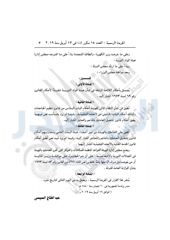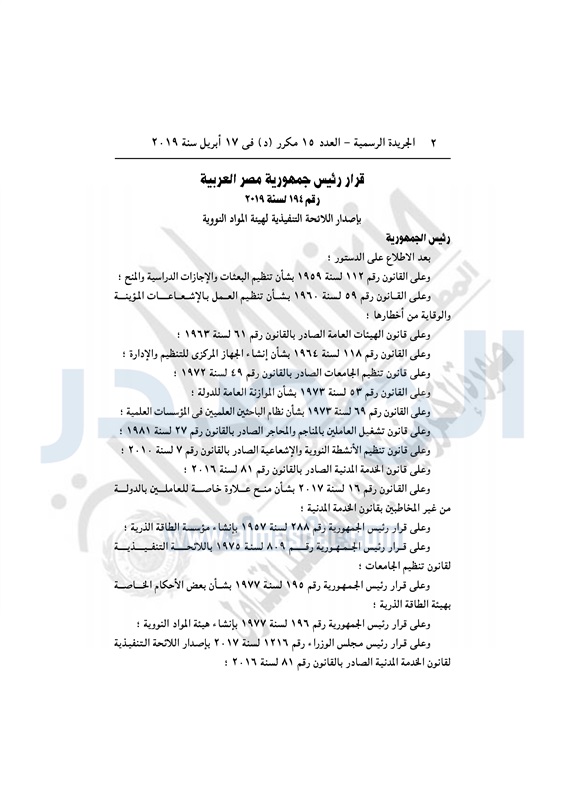بترول وطاقة قرار جمهوري بإصدار اللائحة التنفيذية لهيئة المواد النووية السبت 20 أبريل 2019 - 02:48 م 4/20/2019 2:48:00 PM الرئيس عبد الفتاح السيسي - صورة أرشيفية المصدر - خاص طباعة شارك نشرت الجريدة الرسمية في العدد 15 مكرر «د» بتاريخ 17 أبريل، قرار رئيس الجمهورية رقم 194 لسنة 2019، بإصدار اللائحة التنفيذية لهيئة المواد النووية.وفيما يلي نص القرار: طباعة شارك هيئة المواد النووية السيسى الجريدة الرسمية تابع المصدر علي جوجل نيوز تطبيق نبض