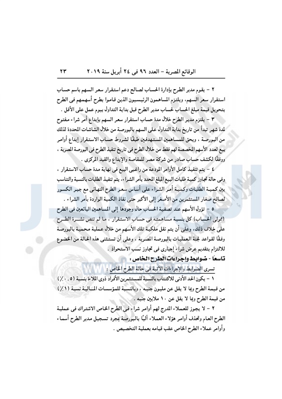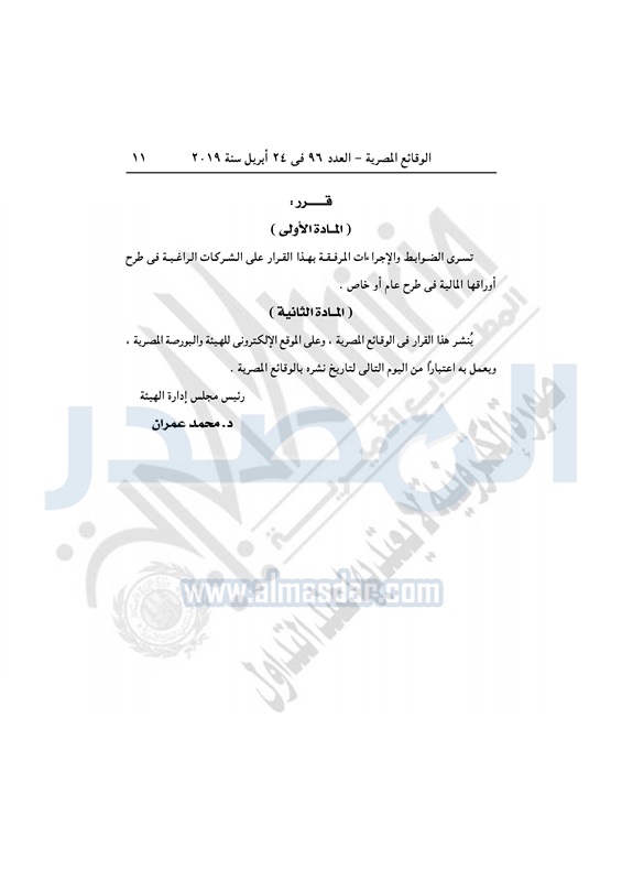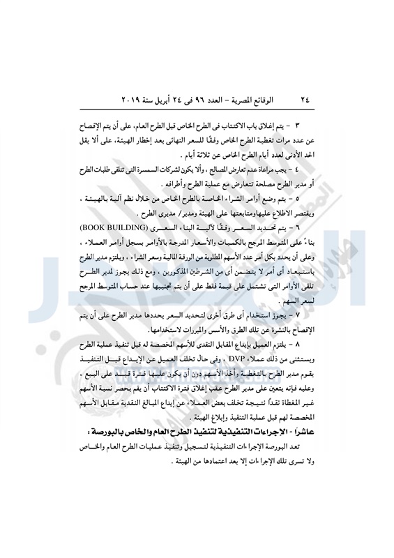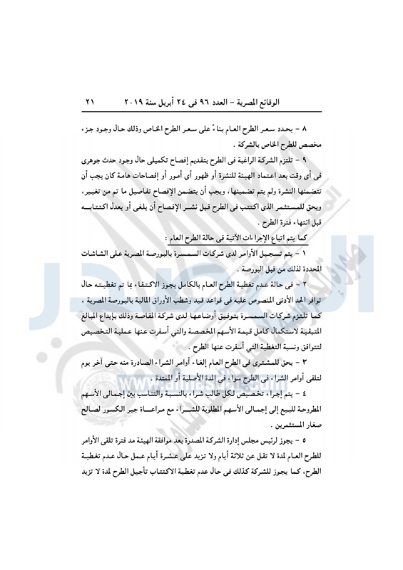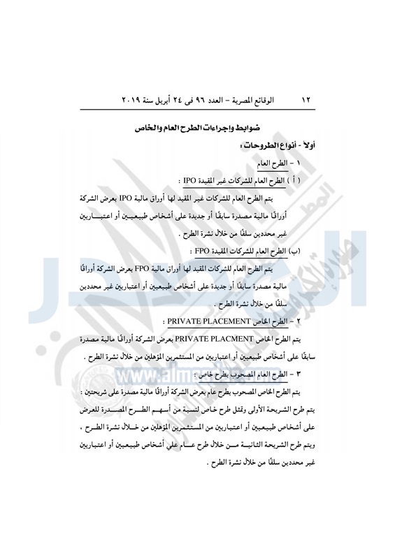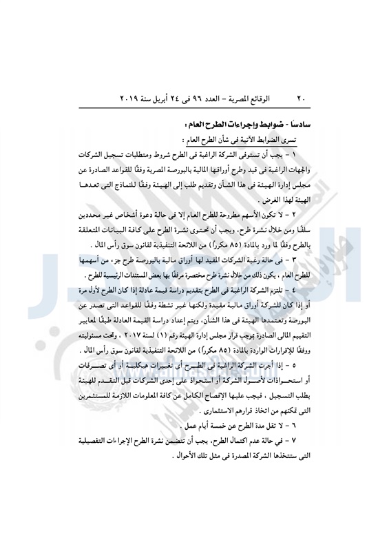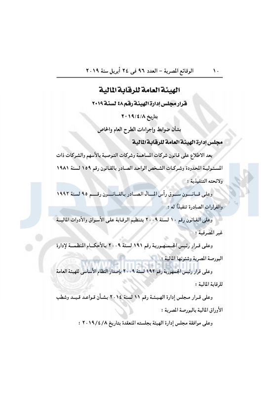 نشرت الوقائع المصرية في العدد 96 بتاريخ 24 أبريل، قرار الهيئة العامة للرقابة المالية، رقم 48 لسنة 2019، بتاريخ 8 أبريل 2019، بشأن ضوابط وإجراءات الطرح العام والخاص.