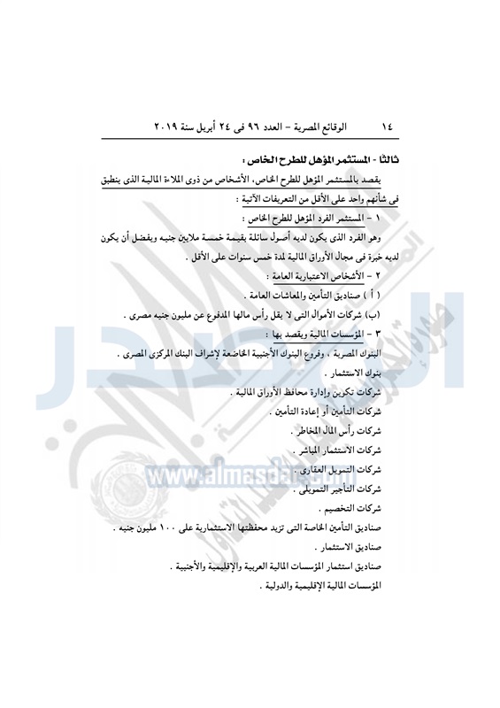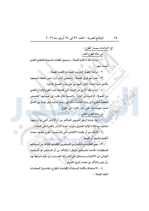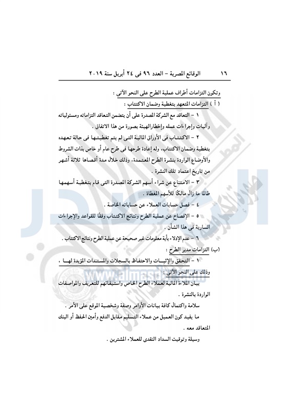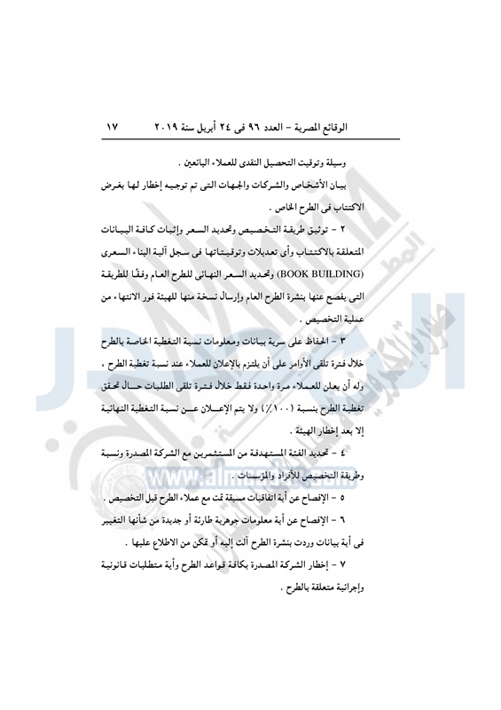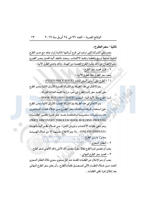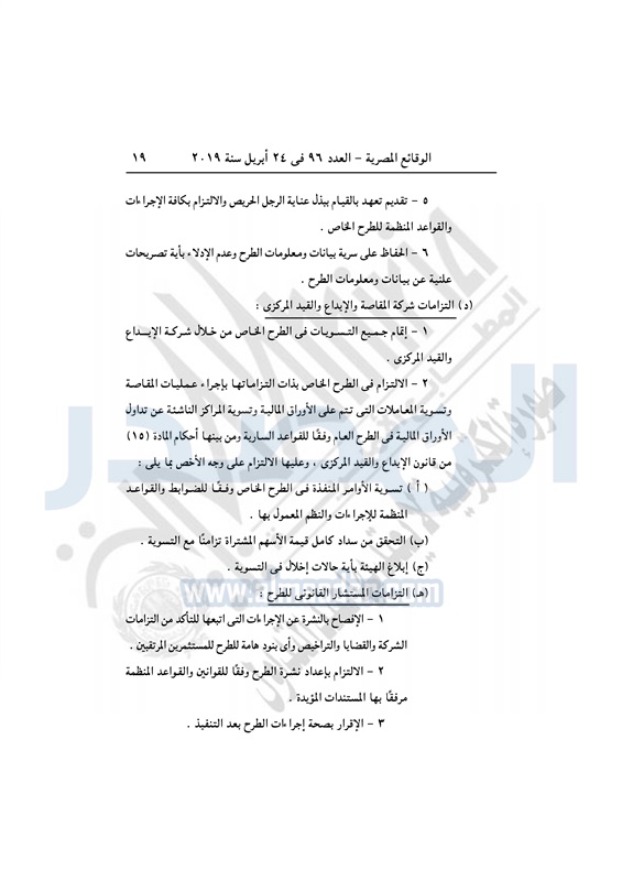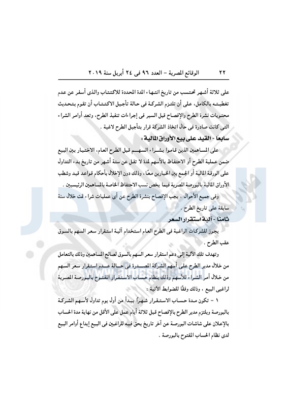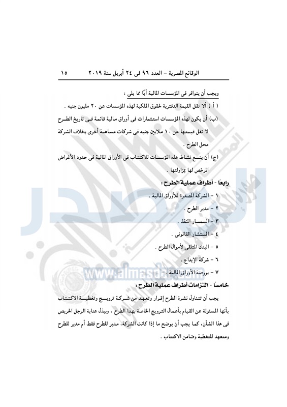 نشرت الوقائع المصرية في العدد 96 بتاريخ 24 أبريل، قرار الهيئة العامة للرقابة المالية، رقم 48 لسنة 2019، بتاريخ 8 أبريل 2019، بشأن ضوابط وإجراءات الطرح العام والخاص.