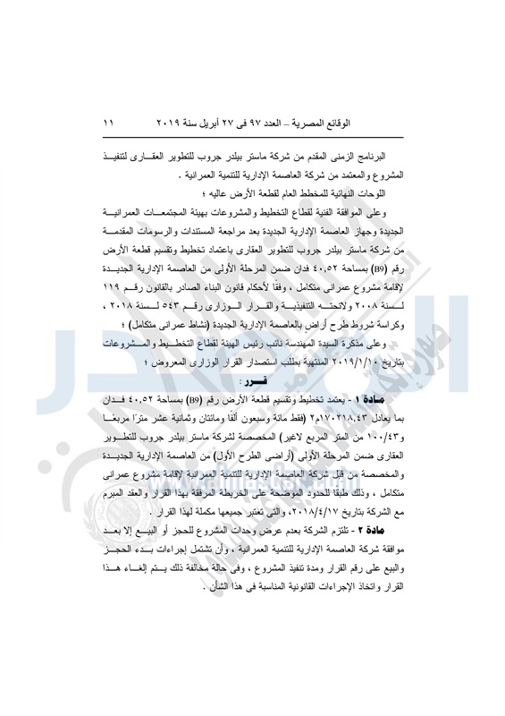 نشرت الوقائع المصرية في العدد 97 بتاريخ 27 أبريل، قرار وزارة الإسكان والمرافق والمجتمعات العمرانية، رقم 54 لسنة 2019، بتاريخ 21 يناير 2019، بشأن اعتماد تخطيط وتقسيم قطعة الأرض رقم «B9» بمساحة 40,52 فدان المخصصة لشركة ماستر بيلدر جروب للتطوير العقاري من قبل شركة العاصمة الإدارية للتنمية العمرانية لإقامة مشروع عمرانى متكامل ضمن المرحلة الأولى من العاصمة الإدارية الجديدة.