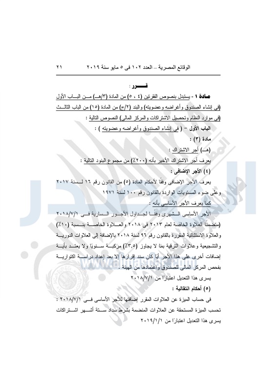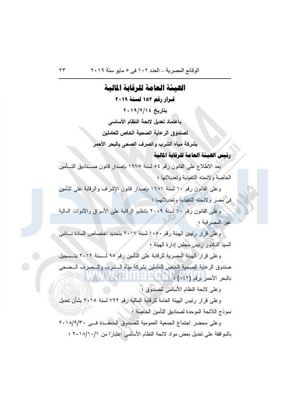 نشرت الوقائع المصرية في العدد 102 بتاريخ 5 مايو 2019، قرارات الهيئة العامة للرقابة المالية، أرقام 149 لسنة 2019 بتاريخ 14 فبراير 2019، بشأن اعتماد تعديل لائحة النظام الأساسي لصندوق التأمين الخاص والزمالة للعاملين بالهيئة العامة للتحكيم واختبارات القطن، و150 لسنة 2019 بتاريخ 14 فبراير 2019، بشأن اعتماد تعديل لائحة النظام الأساسي لصندوق التأمين الخاص بأفراد المخابرات العامة، و152 لسنة 2019 بتاريخ 14 فبراير 2019، بشأن اعتماد تعديل لائحة النظام الأساسي لصندوق الرعاية الصحية الخاص للعاملين بشركة مياه الشرب والصرف الصحي بالبحر الأحمر.