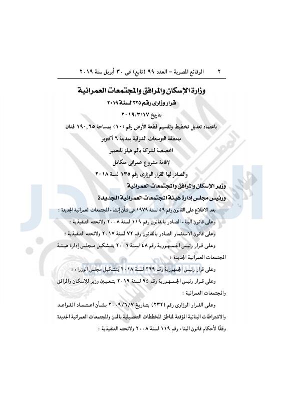 نشرت الوقائع المصرية، في العدد 99 تابع بتاريخ 30 أبريل 2019، قرار وزارة الإسكان والمرافق والمجتمعات العمرانية، رقم 325 لسنة 2019، بتاريخ 17 مارس 2019، بشأن اعتماد تعديل تخطيط وتقسيم قطعة الأرض رقم 10 بمساحة 190.65 فدان بمنطقة التوسعات الشرقية بمدينة 6 اكتوبر المخصصة لشركة بالم هيلز للتعمير لإقامة مشروع عمراني متكامل .