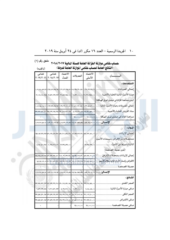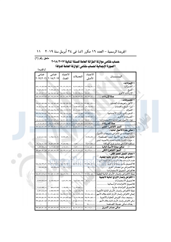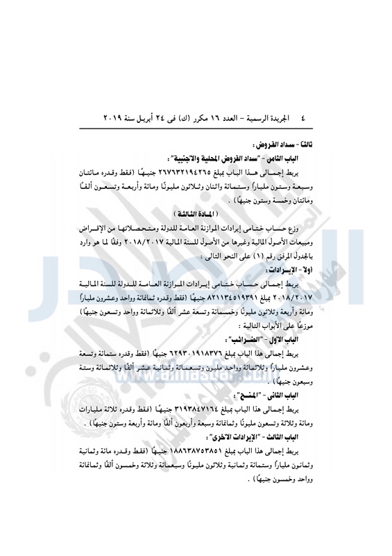 نشرت الجريدة الرسمية في العدد 16 مكرر "ك" بتاريخ 24 أبريل 2019، قرار رئيس الجمهورية بالتصديق على القانون رقم 20 لسنة 2019، بشأن ربط حساب ختامى الموازنة العامة للدولة للسنة المالية 2017-2018.