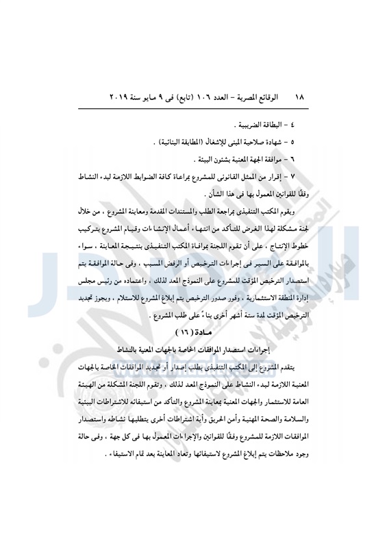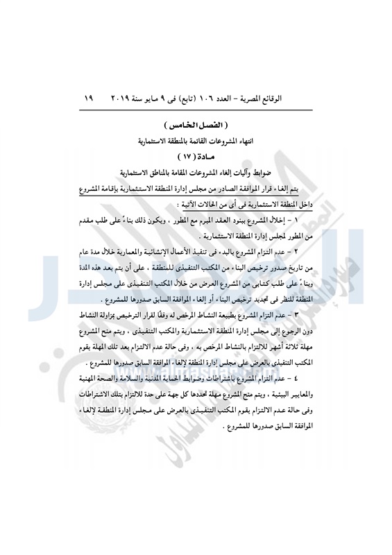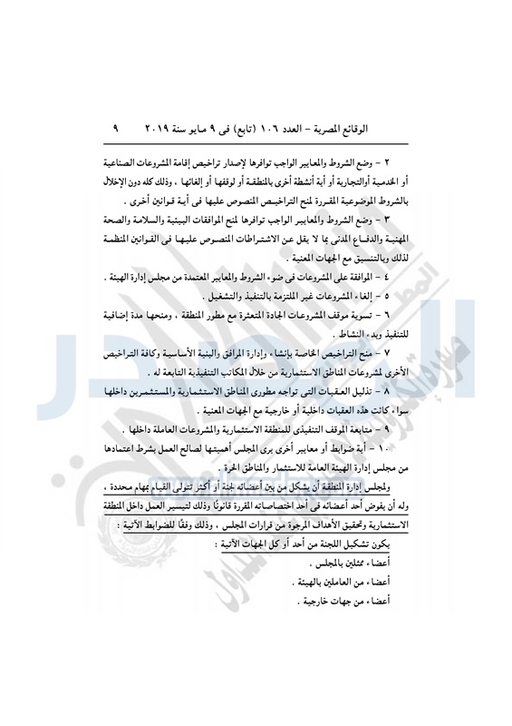 نشرت الوقائع المصرية في العدد 106 تابع الصادر بتاريخ 9 مايو 2019، قرار مجلس إدارة الهيئة العامة للاستثمار والمناطق الحرة رقم 119 لسنة 2019، بشأن إصدار لائحة نظام المناطق الاستثمارية.