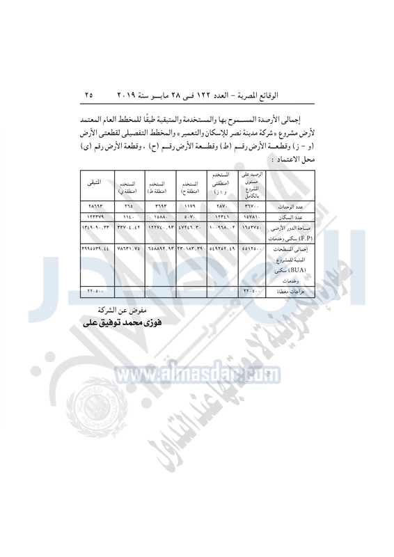 نشرت الوقائع المصرية في العدد 122 بتاريخ 28 مايو، قرار وزارة الإسكان والمرافق والمجتمعات العمرانية، رقم 337 لسنة 2019 بتاريخ 20 مارس 2019 بشأن اعتماد تعديل تخطيط وتقسيم قطعة أرض بمساحة 1312,5 فدان المخصصة لشركة مدينة نصر للإسكان والتعمير - شرق مدينة القاهرة الجديدة لإنشاء مدينة سكنية متكاملة الخدمات.