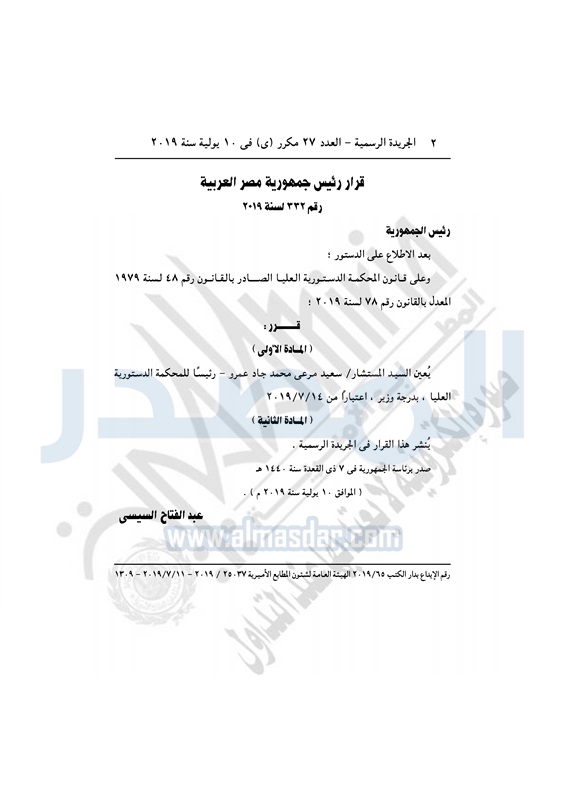 نشرت الجريدة الرسمية في العدد 27 مكرر «ى» بتاريخ 10 يوليو 2019، قرار رئيس الجمهورية، رقم 332 لسنة 2019 ، بتعيين المستشار سعيد مرعي محمد جاد عمرو، رئيساً للمحكمة الدستورية العليا، بدرجة وزير، اعتباراً من 14 يوليو الجاري.