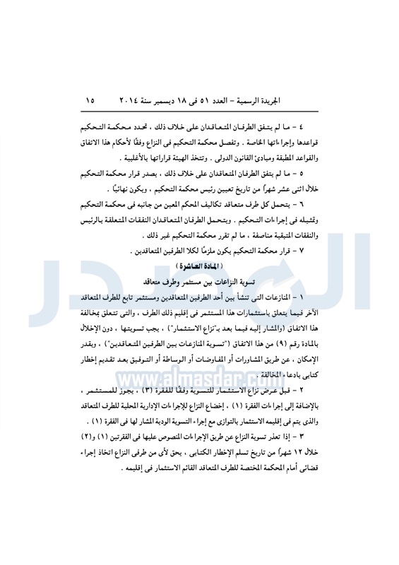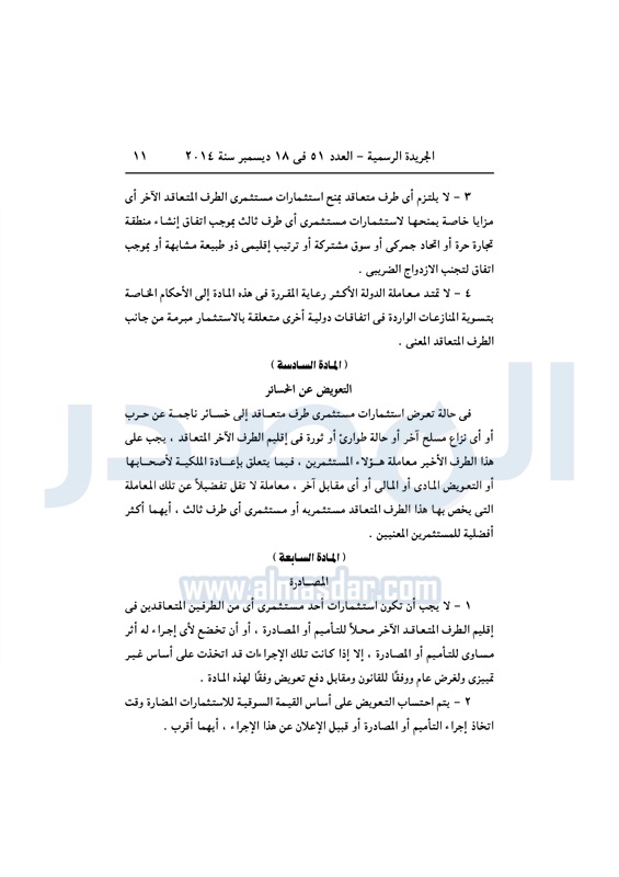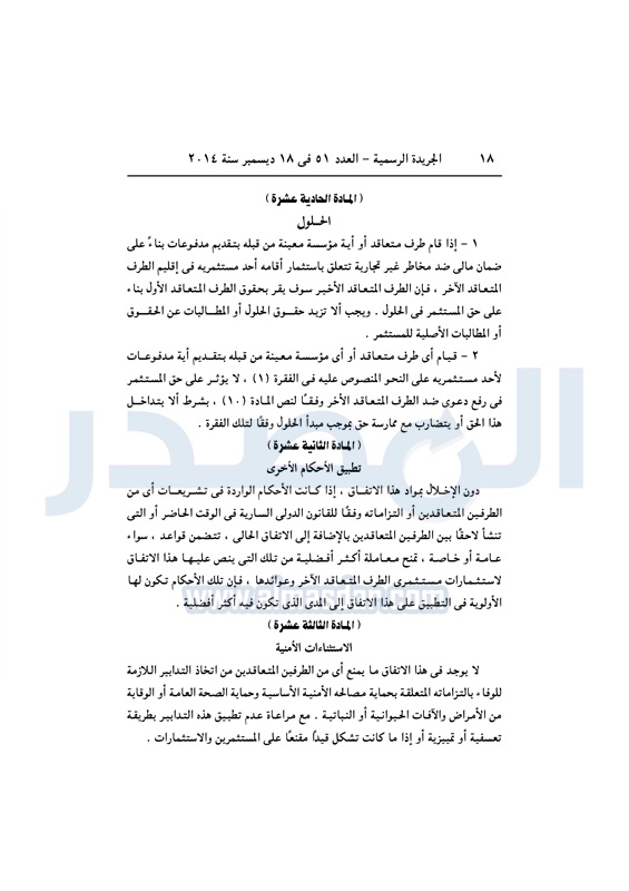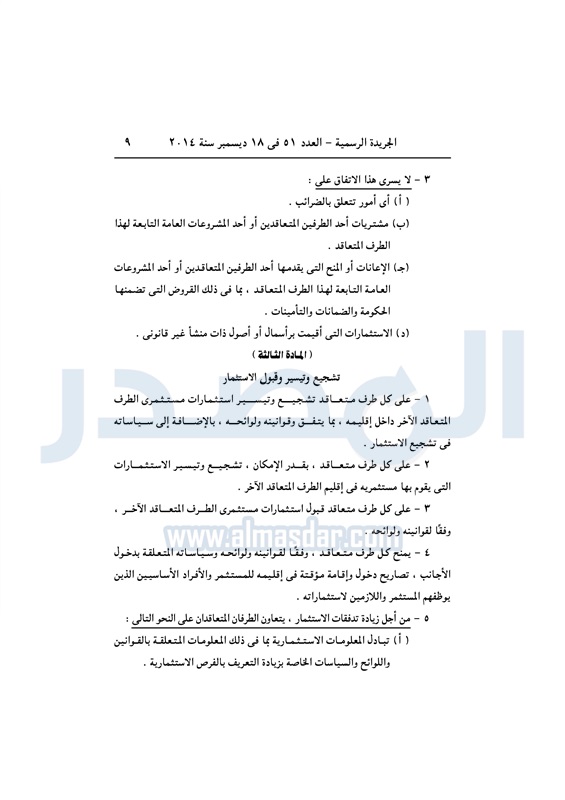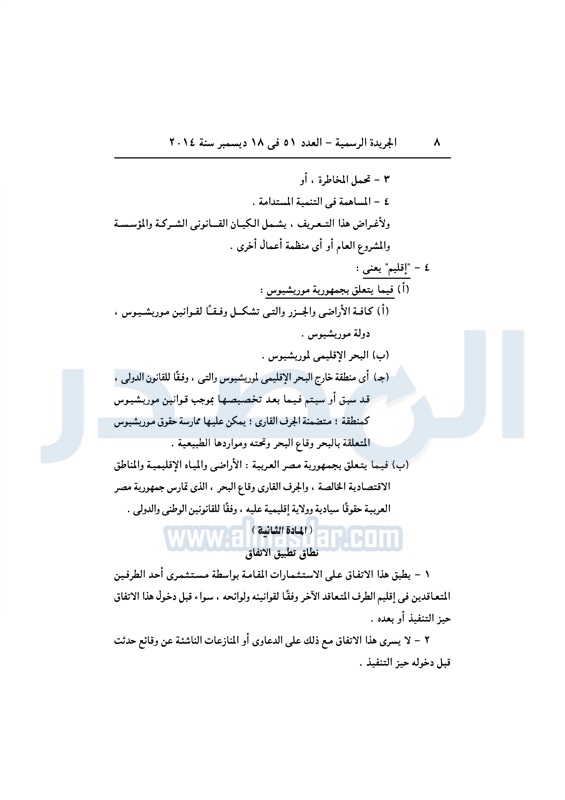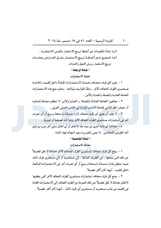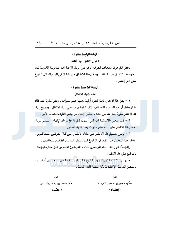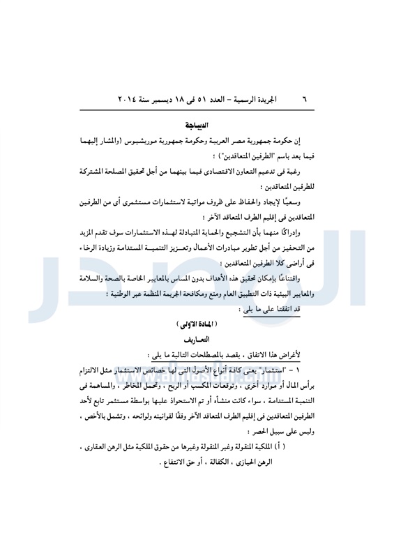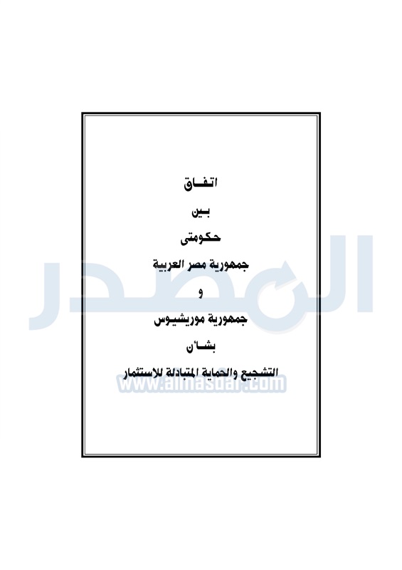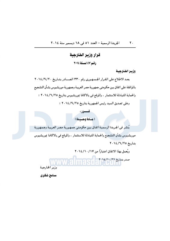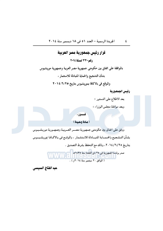 نشرت الجريدة الرسمية فى العدد (51) الصادر فى 18ديسمبر 2014قرار رئيس جمهورية مصر العربية الرئيس عبد الفتاح السيسى رقم 330لسنة 2014بشأن الموافقة على الاتفاق بين حكومتى جمهورية مصر العربية وجمهورية موريشيوس بشأن التشجيع والحماية المتبادلة للاستثمار .
