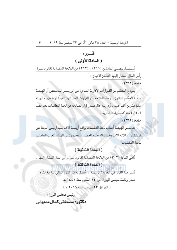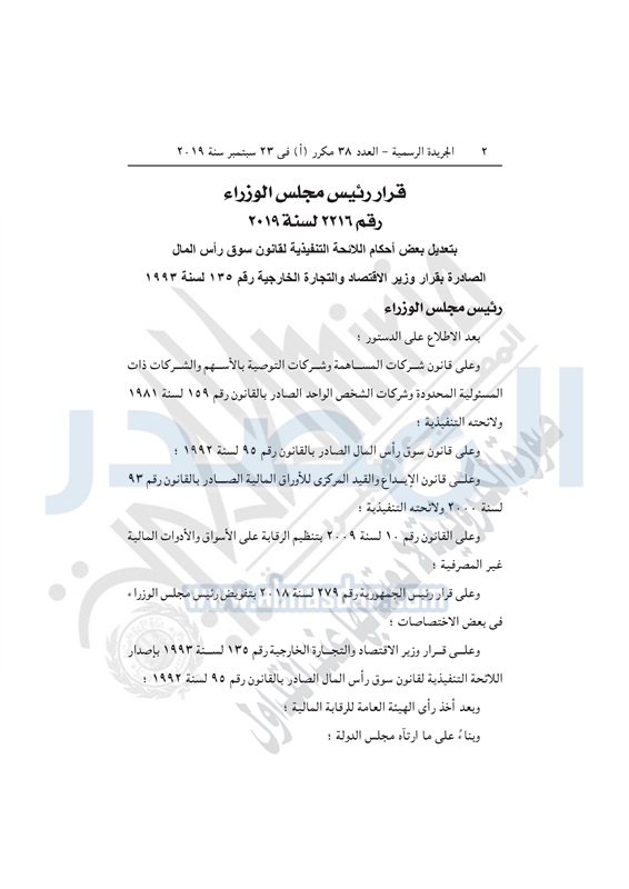 نشرت الجريدة الرسمية في العدد 38 مكرر "أ" بتاريخ 23 سبتمبر 2019، قرار رئيس مجلس الوزراء رقم 2216 لسنة 2019 ، بتعديل بعض أحكام اللائحة التنفيذية لقانون سوق رأس المال.