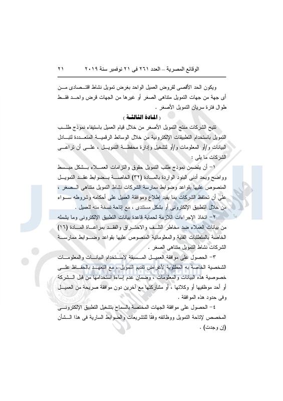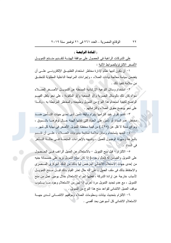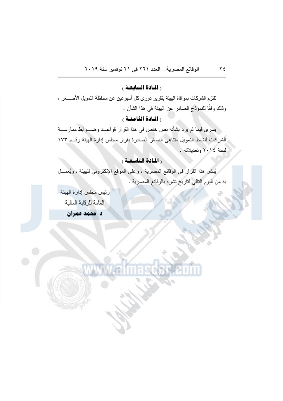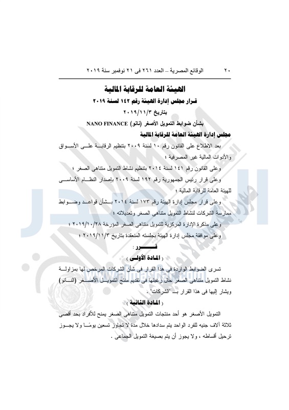 نشرت الوقائع المصرية في العدد 261 الصادر بتاريخ 21 نوفمبر 2019، قرار مجلس إدارة الهيئة العامة للرقابة المالية، رقم 142 لسنة 2019 بتاريخ 3 نوفمبر 2019، بشأن ضوابط التمويل الأصغر "نانو" Nano Finance.