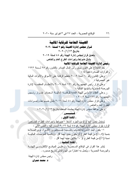 نشرت الوقائع المصرية في العدد رقم 27 بتاريخ 3 فبراير 2020، قرار مجلس إدارة الهيئة العامة للرقابة المالية رقم 7 لسنة 2020، بتعديل قرار مجلس إدارة الهيئة رقم 48 لسنة 2019 ، بشأن وضوابط وإجراءات الطرح العام والخاص.
