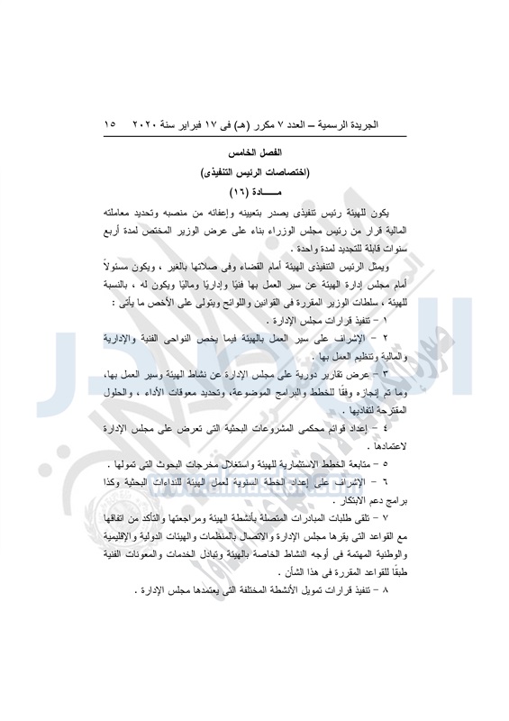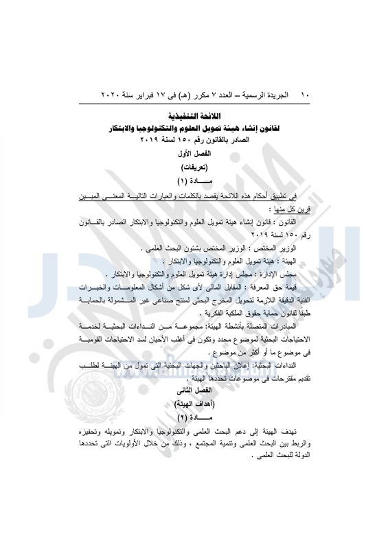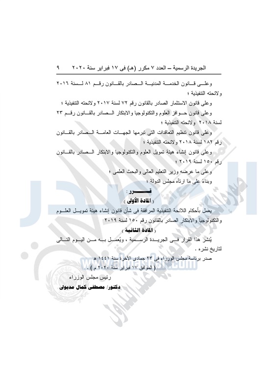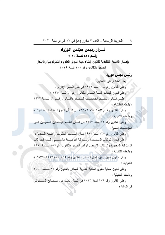 نشرت الجريدة الرسمية في العدد 7 مكرر "ه" بتاريخ 17 فبراير 2020، قرار رئيس مجلس الوزراء رقم 423 لسنة 2020 ، بإصدار اللائحة التنفيذية لقانون إنشاء هيئة تمويل العلوم والتكنولوجيا والابتكار.