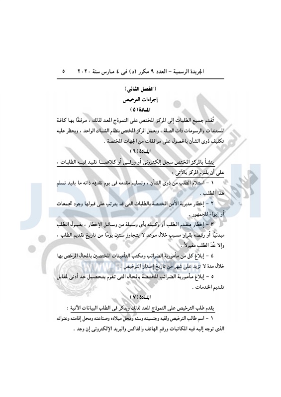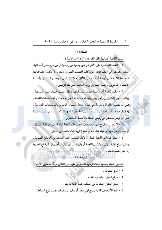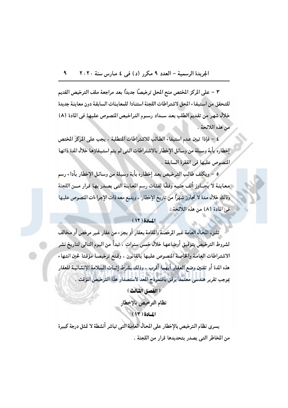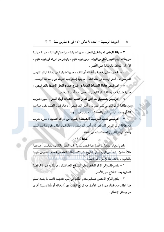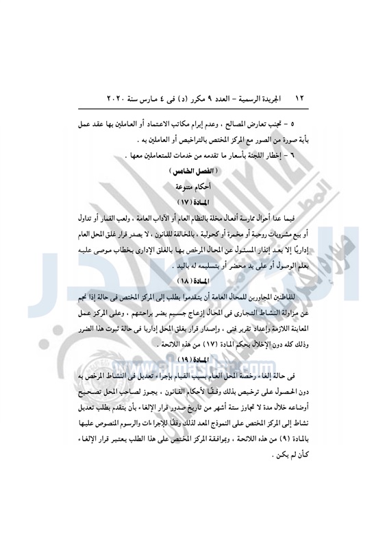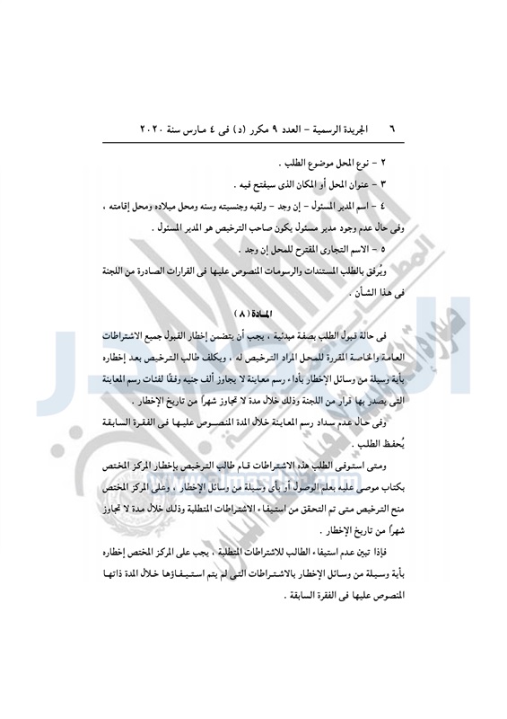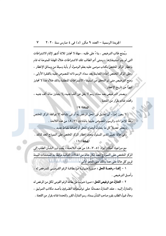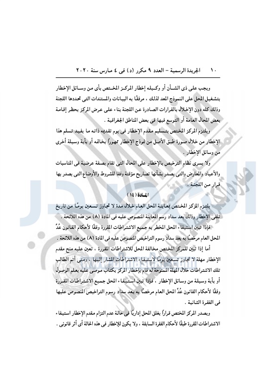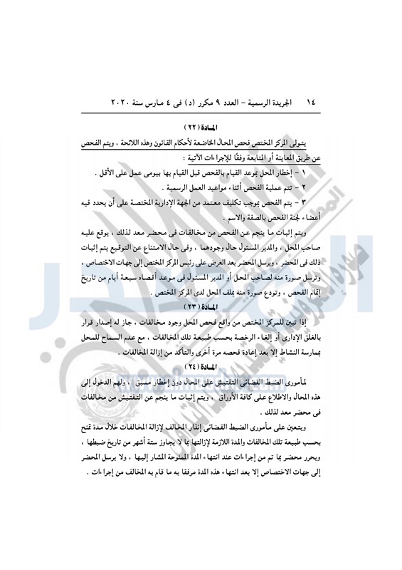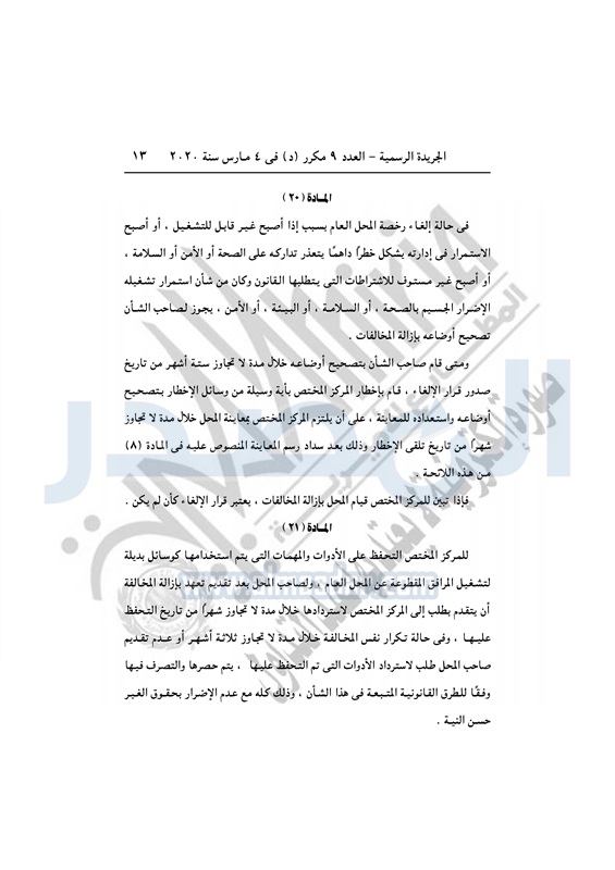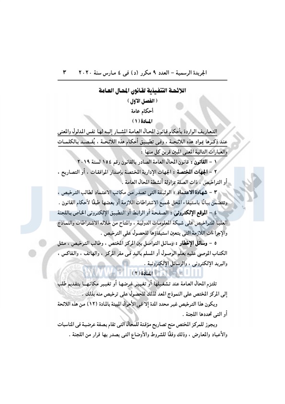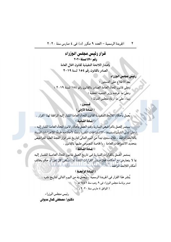 نشرت الجريدة الرسمية في العدد رقم 9 مكرر "د" بتاريخ 4 مارس 2020، قرار رئيس مجلس الوزراء رقم 590 لسنة 2020، باصدار اللائحة التنفيذية لقانون المحال العامة الصادر بالقانون رقم 154 لسنة 2019.