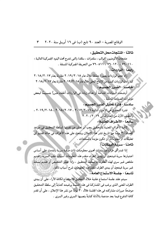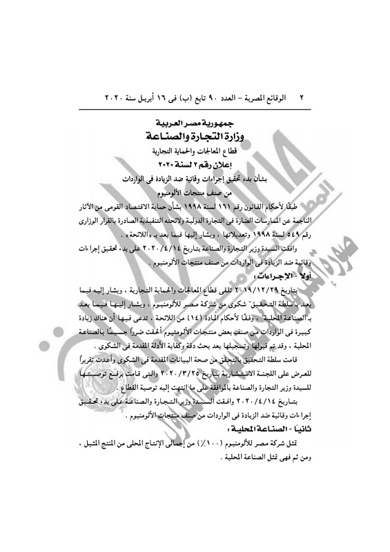 نشرت الوقائع المصرية في العدد 90 تابع "ب" الصادر بتاريخ 16 أبريل 2020، قرار وزارة التجارة والصناعة قطاع المعالجات والحماية التجارية إعلان رقم 2 لسنة 2020، بشأن بدء تحقيق إجراءات وقائية ضد الزيادات فى الواردات من صنف منتجات الألومنيوم.