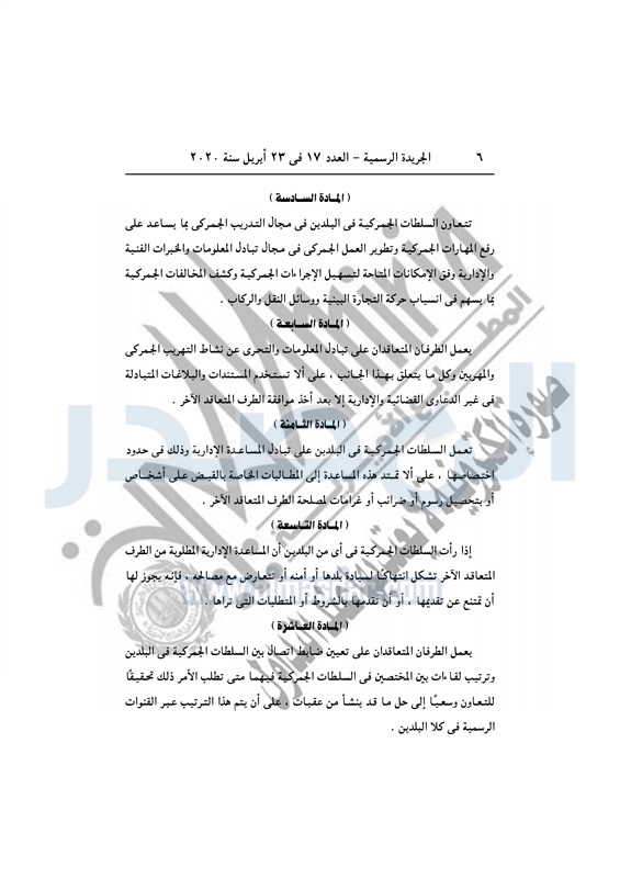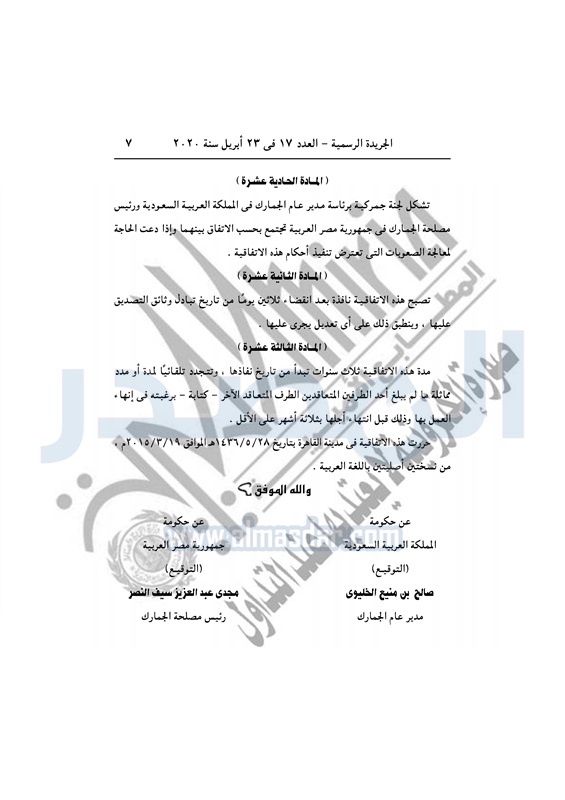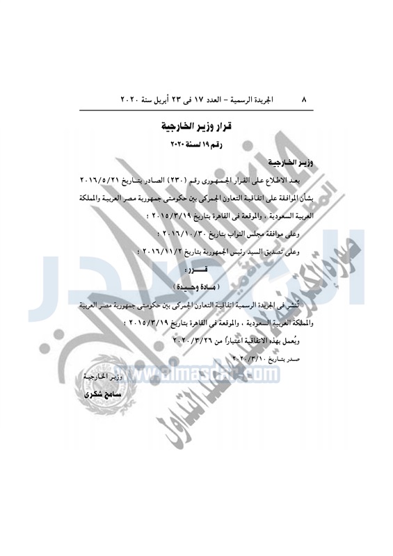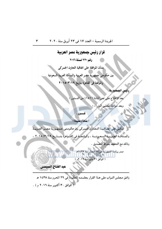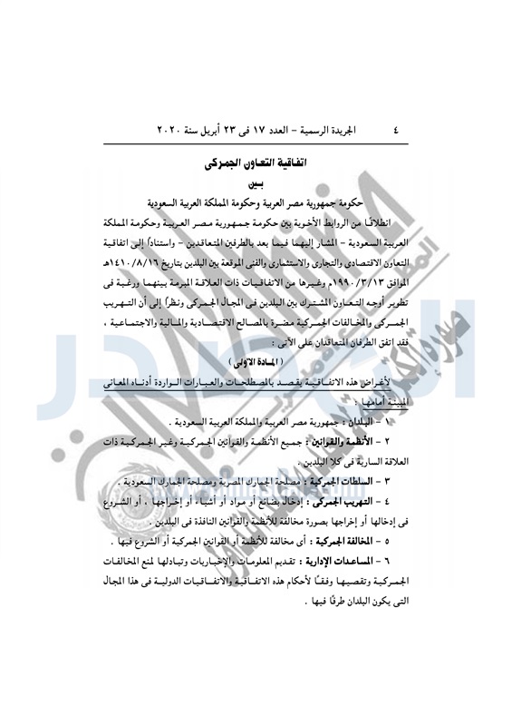 نشرت الجريدة الرسمية في العدد رقم 17 بتاريخ 23 أبريل 2020، قرار رئيس الجمهورية رقم 230 لسنة 2016، بشأن الموافقة على اتفاقية التعاون الجمركى بين مصر والسعودية والموقعة فى القاهرة بتاريخ 19 مارس عام 2015.