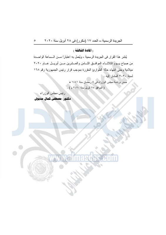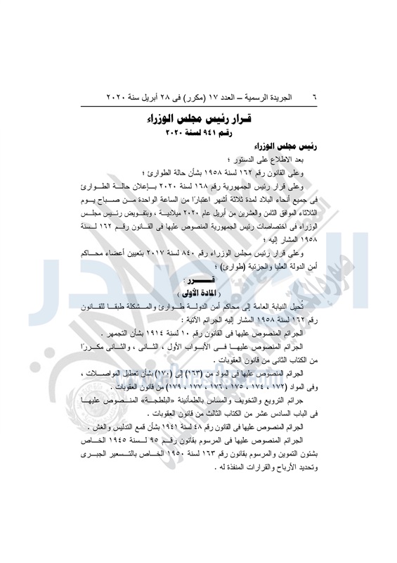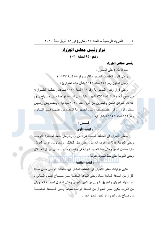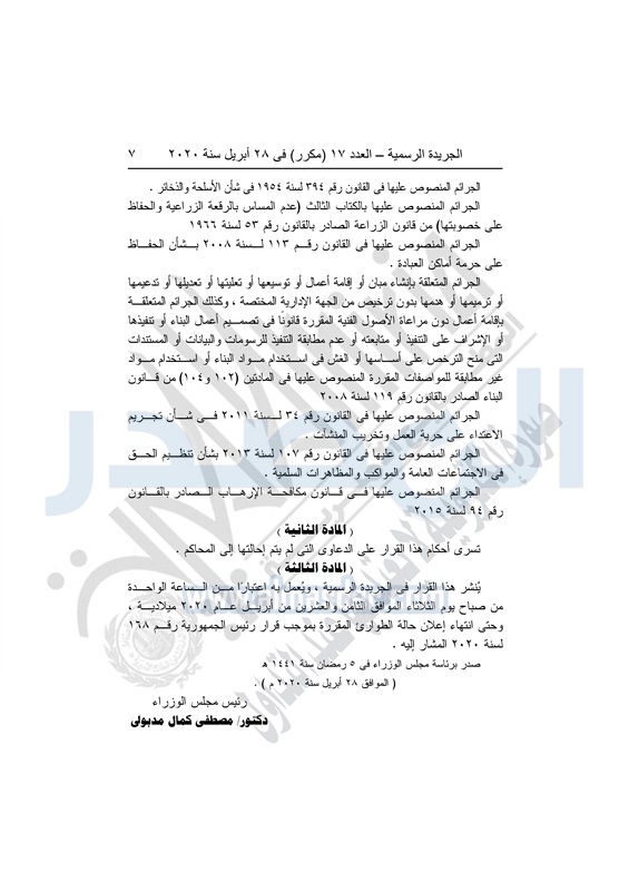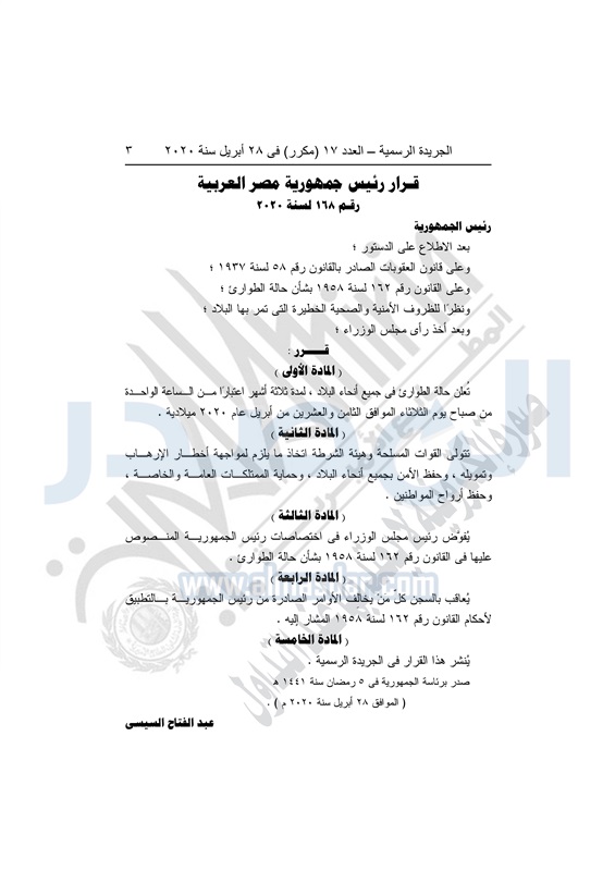 نشرت الجريدة الرسمية في العدد رقم 17 "مكرر" بتاريخ 28 أبريل 2020، قرار رئيس الجمهورية رقم 168 لسنة 2020، بإعلان حالة الطوارئ في جميع أنحاء البلاد لمدة 3 أشهر، اعتباراً من الواحدة من صباح اليوم الثلاثاء 28 أبريل 2020.