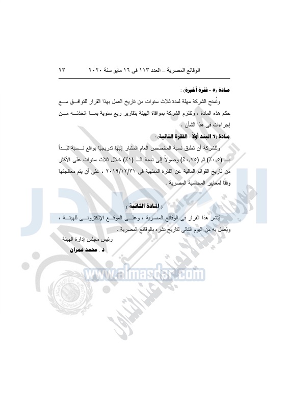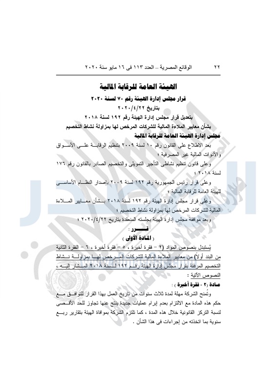 نشرت الوقائع المصرية في العدد رقم 113 بتاريخ 16 مايو 2020، قرار مجلس إدارة الهيئة العامة للرقابة المالية رقم 70 لسنة 2020، بتعديل قرار مجلس إدارة الهيئة رقم 192 لسنة 2018 ، بشأن معايير الملاءة المالية للشركات المرخص لها بمزاولة نشاط التخصيم.