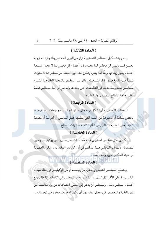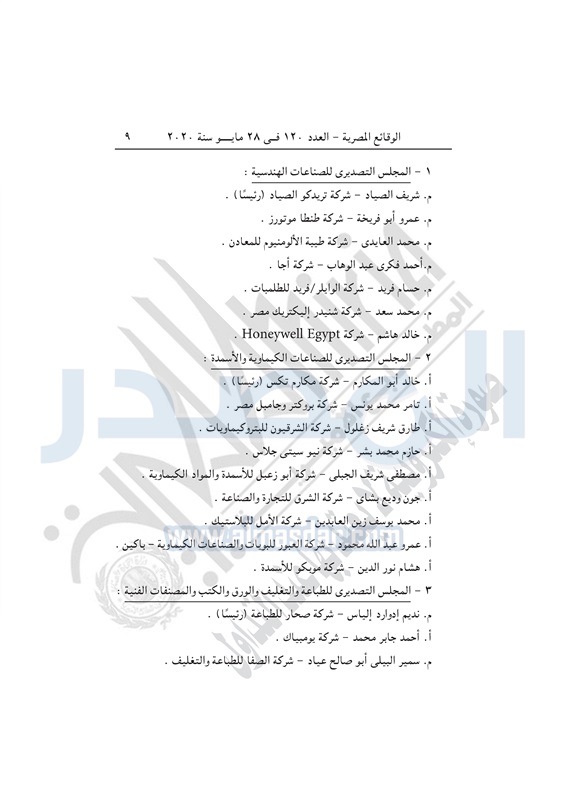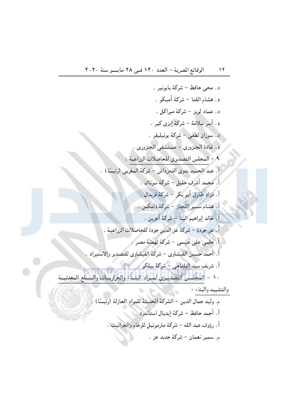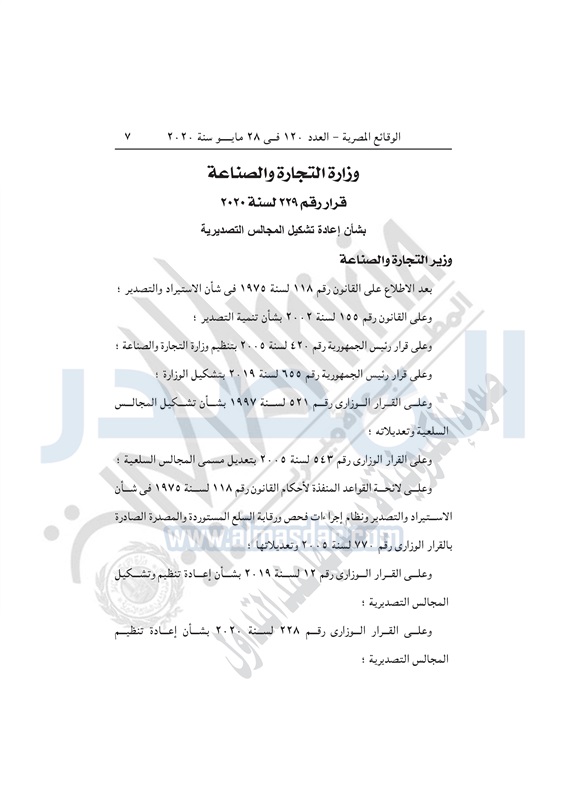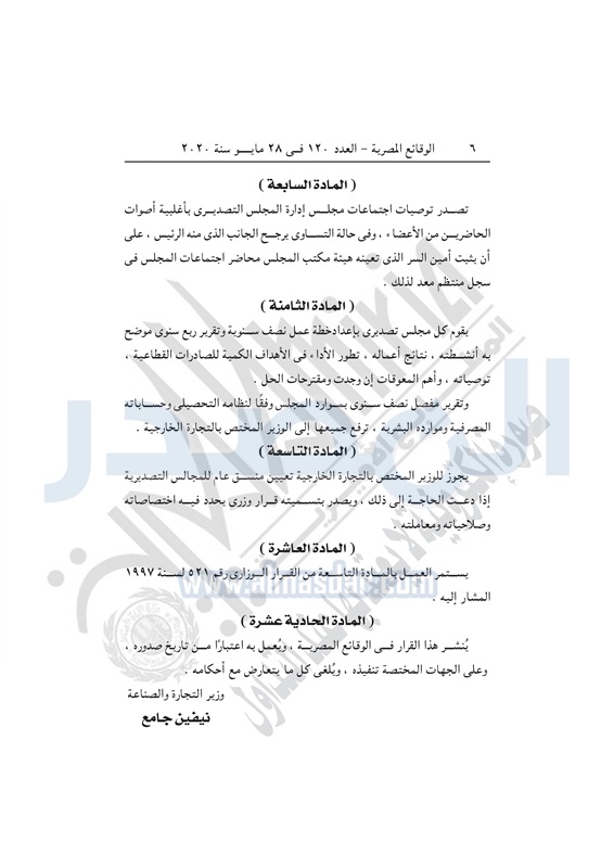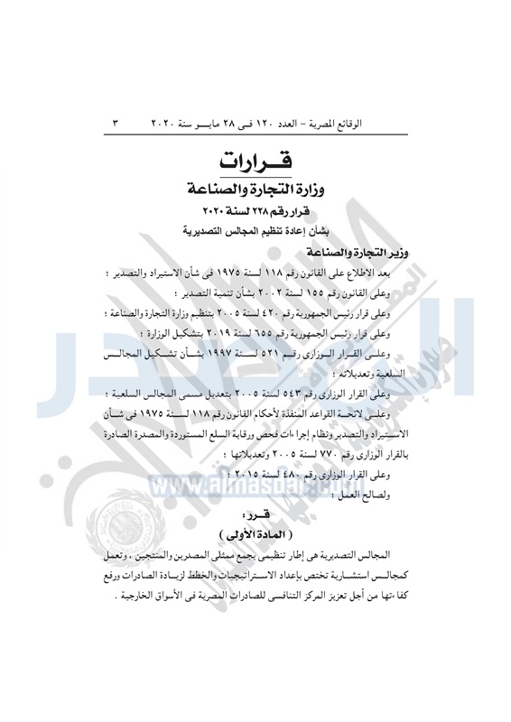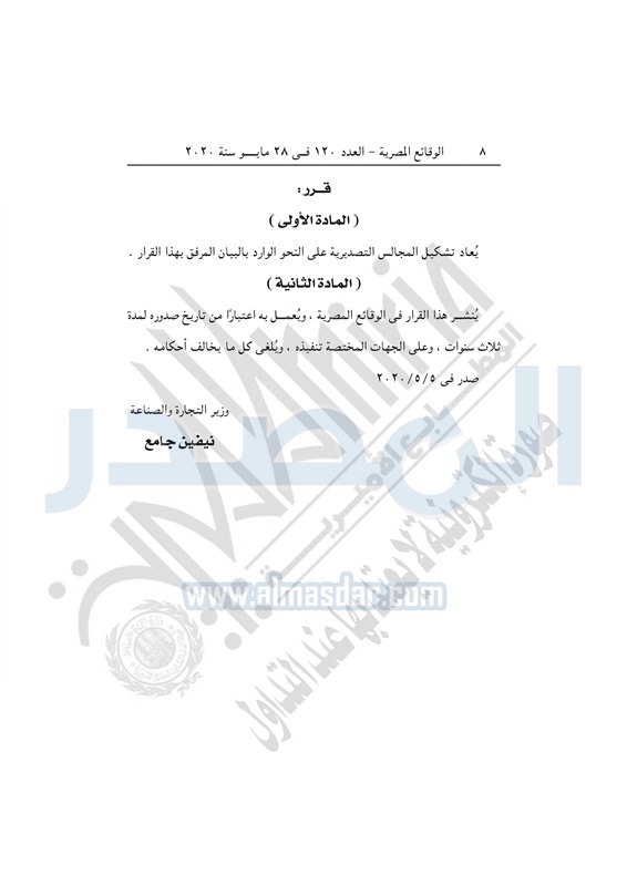 أسواق وزيرة التجارة تصدر قراراً بإعادة تنظيم المجالس التصديرية الخميس 28 مايو 2020 - 04:03 م 5/28/2020 4:03:00 PM نيفين جامع وزيرة التجارة والصناعة المصدر - خاص طباعة شارك نشرت الوقائع المصرية في العدد 120 الصادر بتاريخ 28 مايو 2020، قرار وزارة التجارة والصناعة رقم 228 لسنة 2020، بشأن إعادة تنظيم المجالس التصديرية.وفيما يلي نص القرار: طباعة شارك تابع المصدر علي جوجل نيوز تطبيق نبض