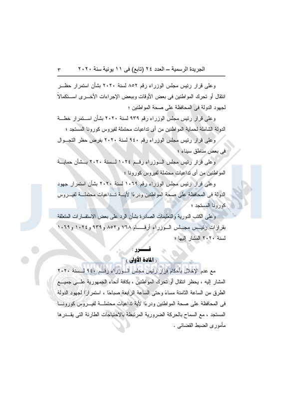 ونصت المادة الأولى من القرار على أنه مع عدم الإخلال بأحكام قرار رئيس مجلس الوزراء رقم 940 لسنة 2020 "الخاص بفرض حظر التجول في بعض مناطق سيناء"، واستمراراً لجهود الدولة في المحافظة على صحة المواطنين ودرءاً لأية تداعيات محتملة لفيروس "كورونا" المستجد، يحظر انتقال أو تحرك المواطنين، بكافة أنحاء الجمهورية على جميع الطرق بدءاً من الساعة الثامنة مساءً وحتى الساعة الرابعة صباحاً، مع السماح بالحركة الضرورية المرتبطة بالاحتياجات الطارئة التي يقدرها مأمورو الضبط القضائي.